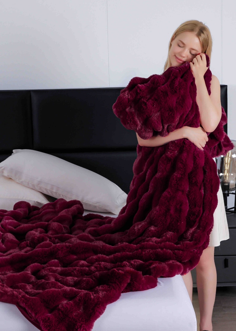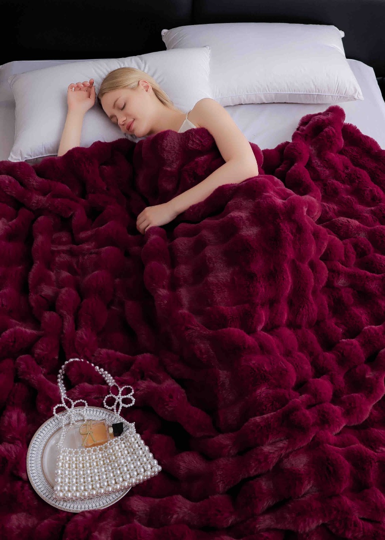Patura Luxury Soft Touch, Jojo Home, cu Blanita Artificiala Tip Iepure, 200x230 cm, cu Fermoar, Grena