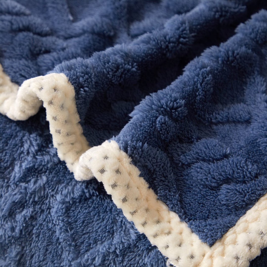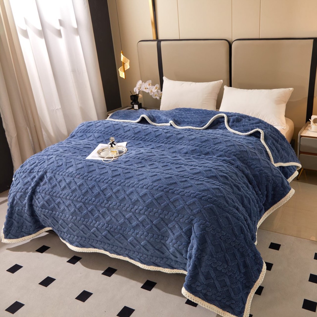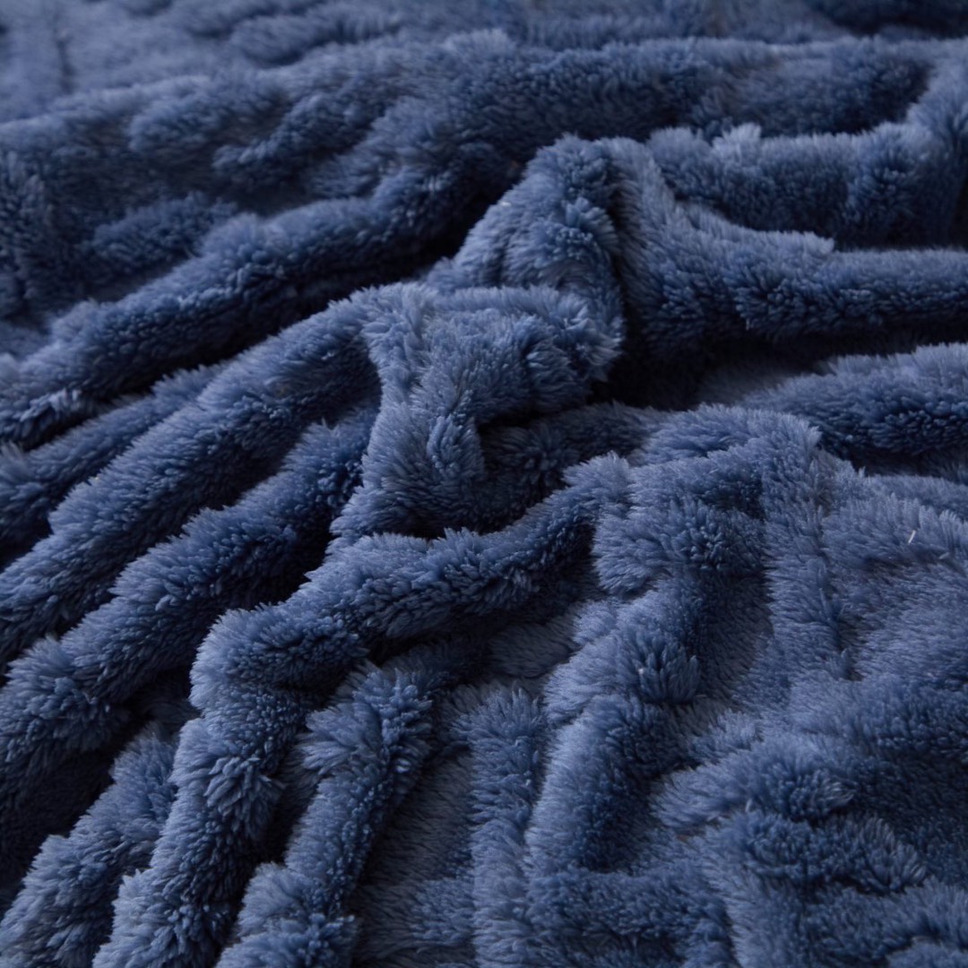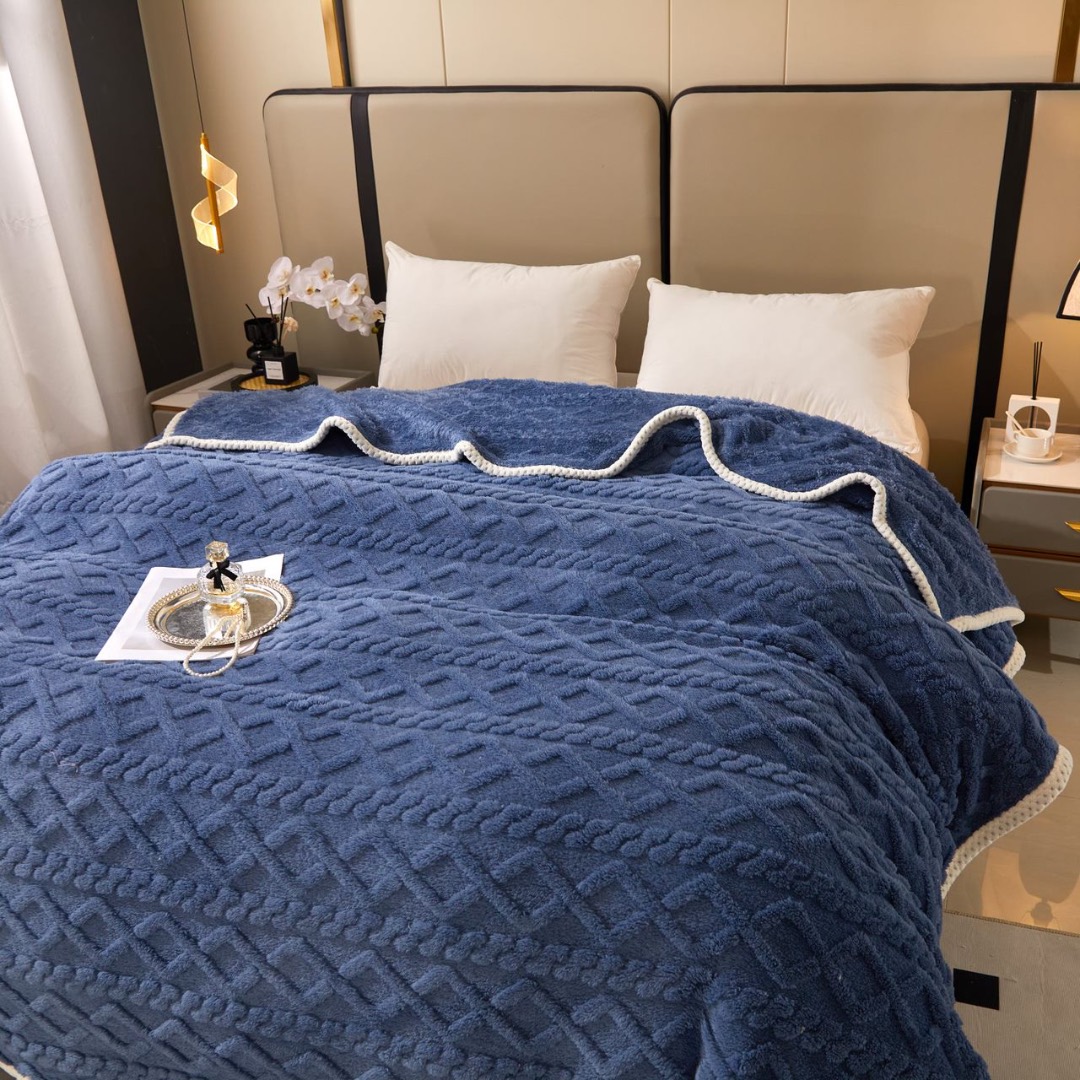 Patura Premium, 200x230cm, CoCoLiNo, Grofata, cu Model 3D Tip Tricotaj si Bordura din Blanita Contrastanta – Eleganta si Caldura Absoluta, Bleumarin