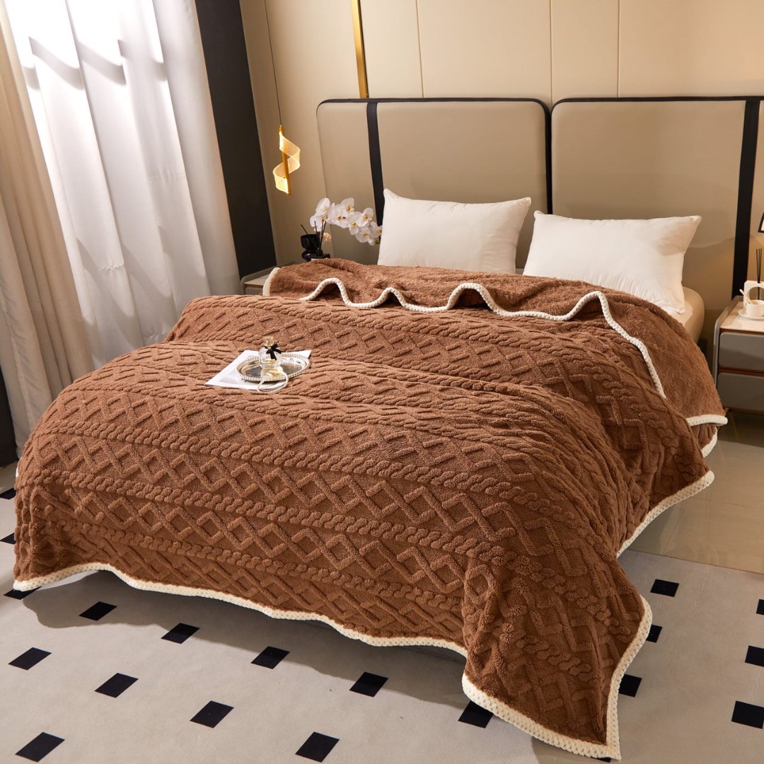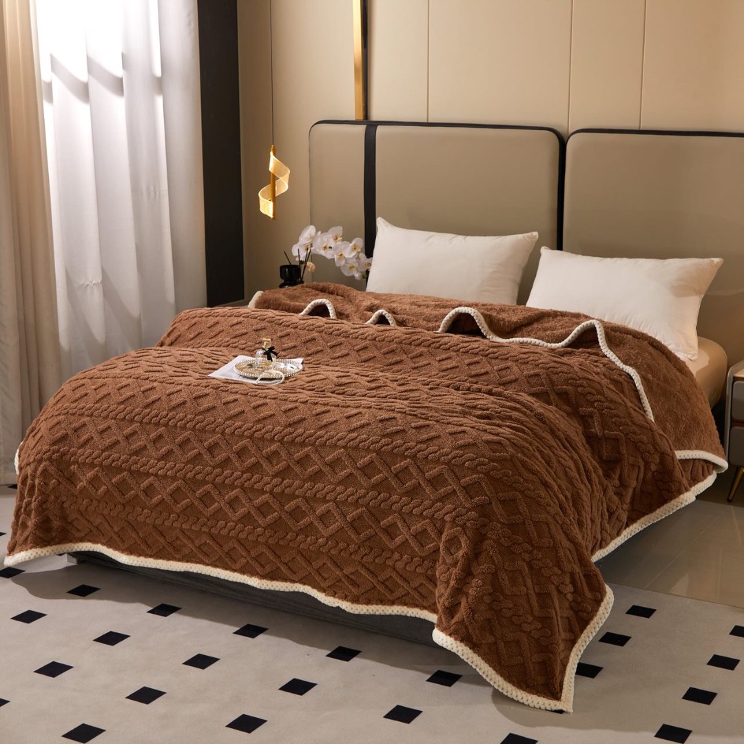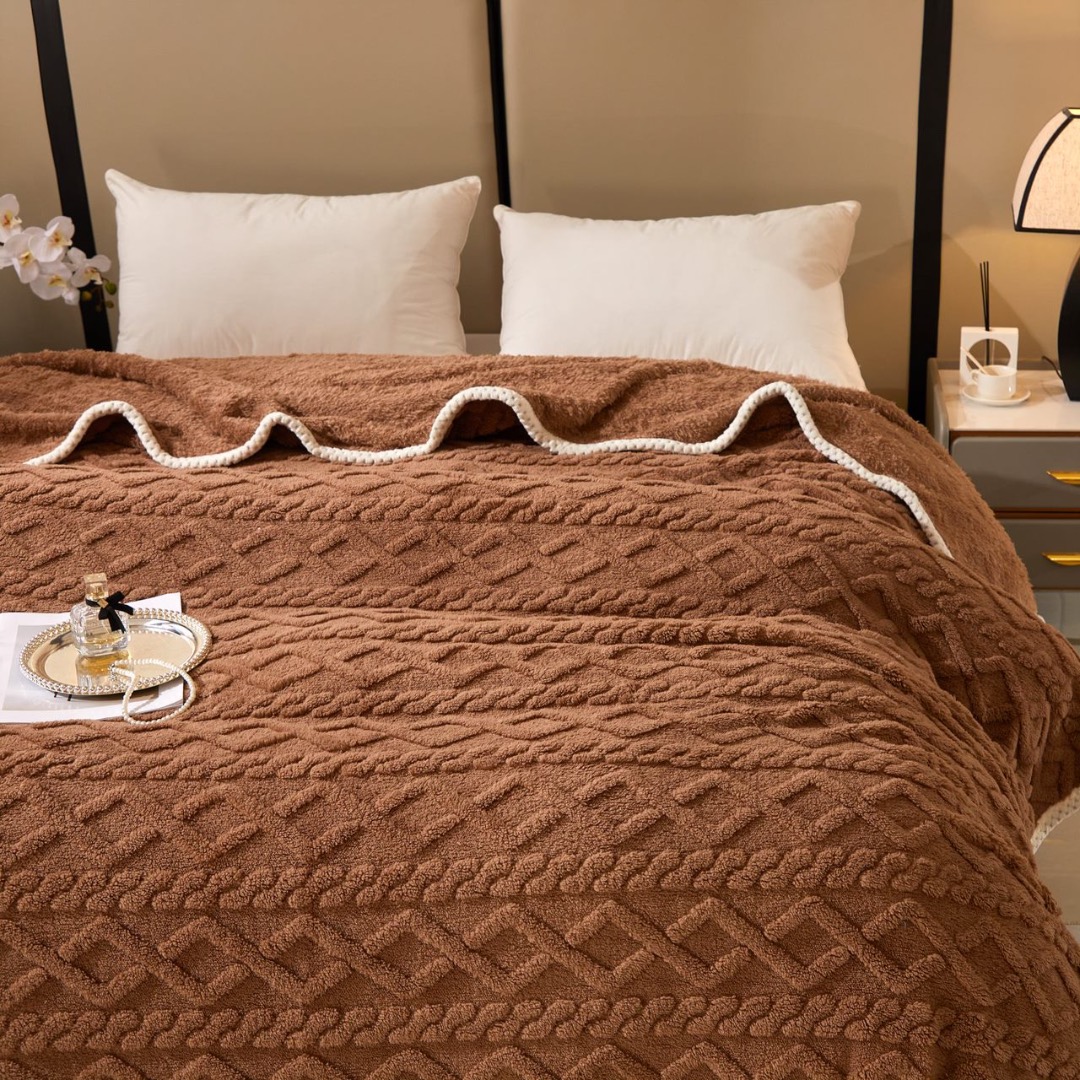 Patura Premium, 200x230cm, CoCoLiNo, Grofata, cu Model 3D Tip Tricotaj si Bordura din Blanita Contrastanta – Eleganta si Caldura Absoluta, Maro