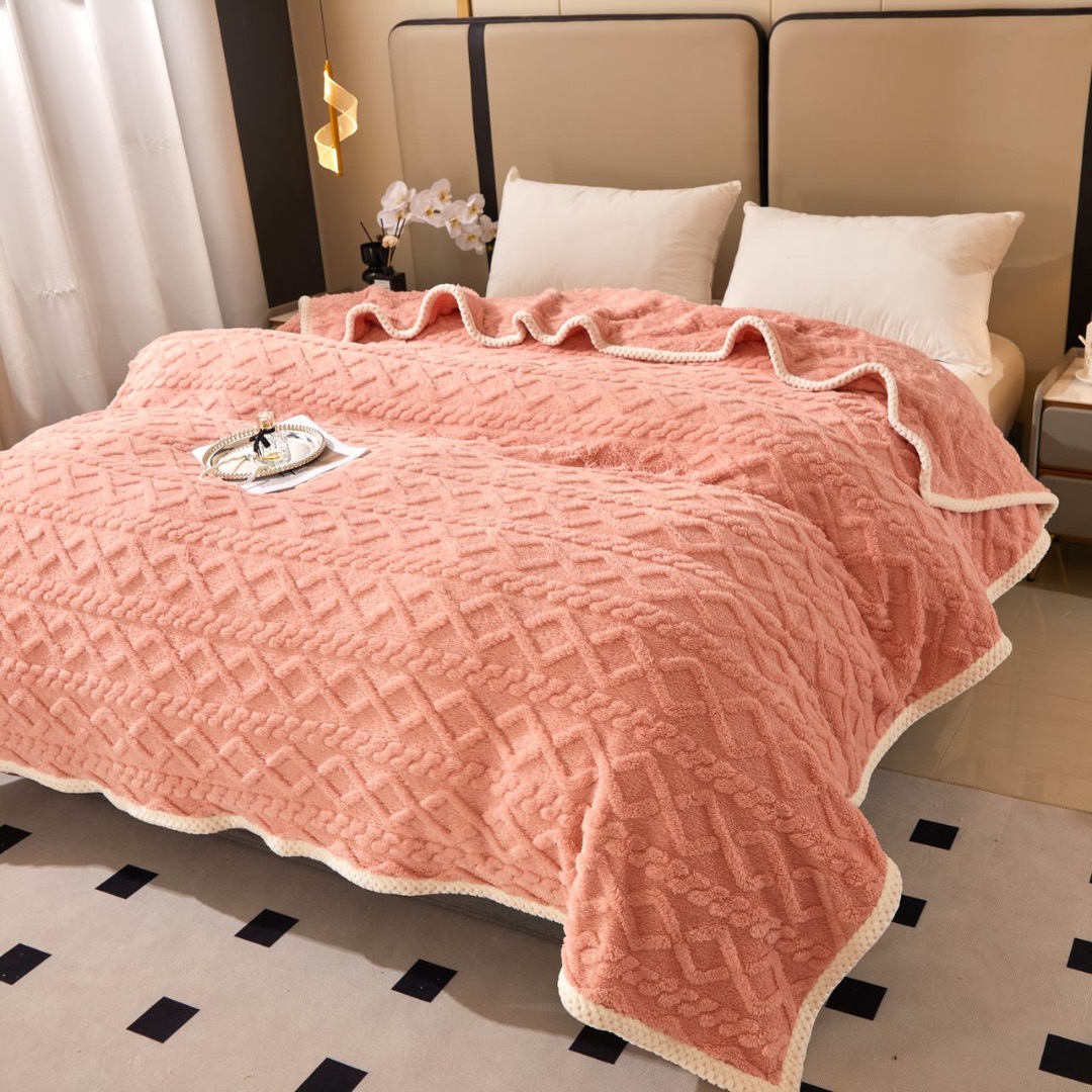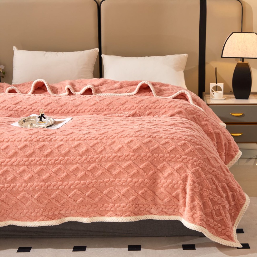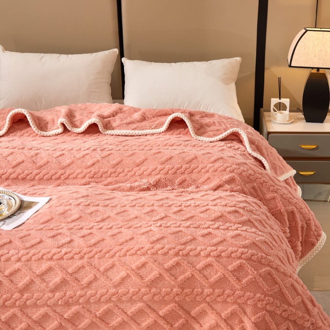 Patura Premium, 200x230cm, CoCoLiNo, Grofata, cu Model 3D Tip Tricotaj si Bordura din Blanita Contrastanta – Eleganta si Caldura Absoluta, Somon