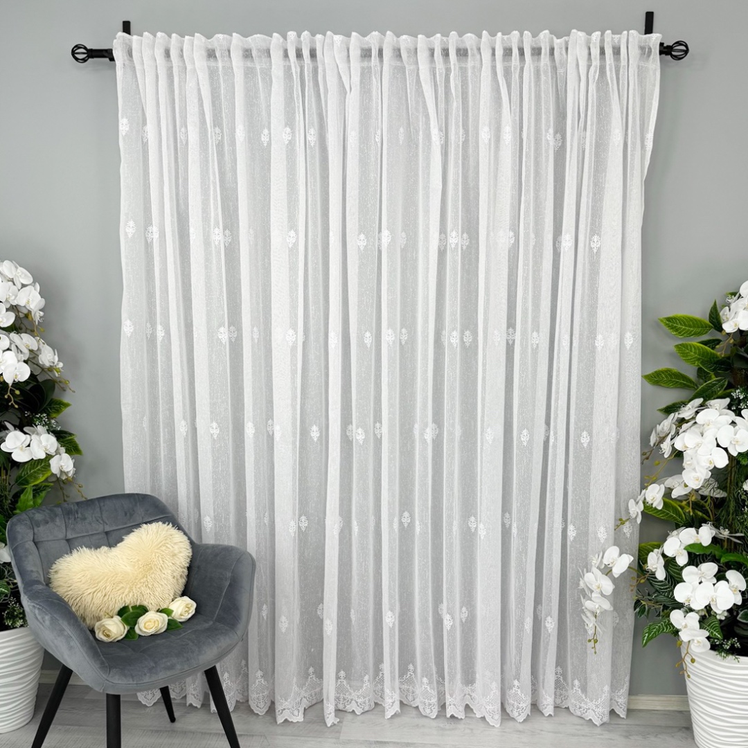 Perdea tip in brodat, dimensiune standard, cu rejansa pt bara. COMPOZITIA MATERIALULUI:  100% poliester CONTINUTUL PACHETULUI: perdea, pe dimensiune standard - 1 bucata 140x260cm.INTRETINEREA PRODUSULUI: Se spala la max. 30°C si se calca la temperatura normala, cu abur. Nu se recomanda spalarea cu inalbitori chimici si nici uscarea prin centrifugare. Inainte de prima utilizare, recomandam spalarea draperiilor, pentru a elimina eventualele impuritati si urme de praf. SISTEM DE PRINDERE: