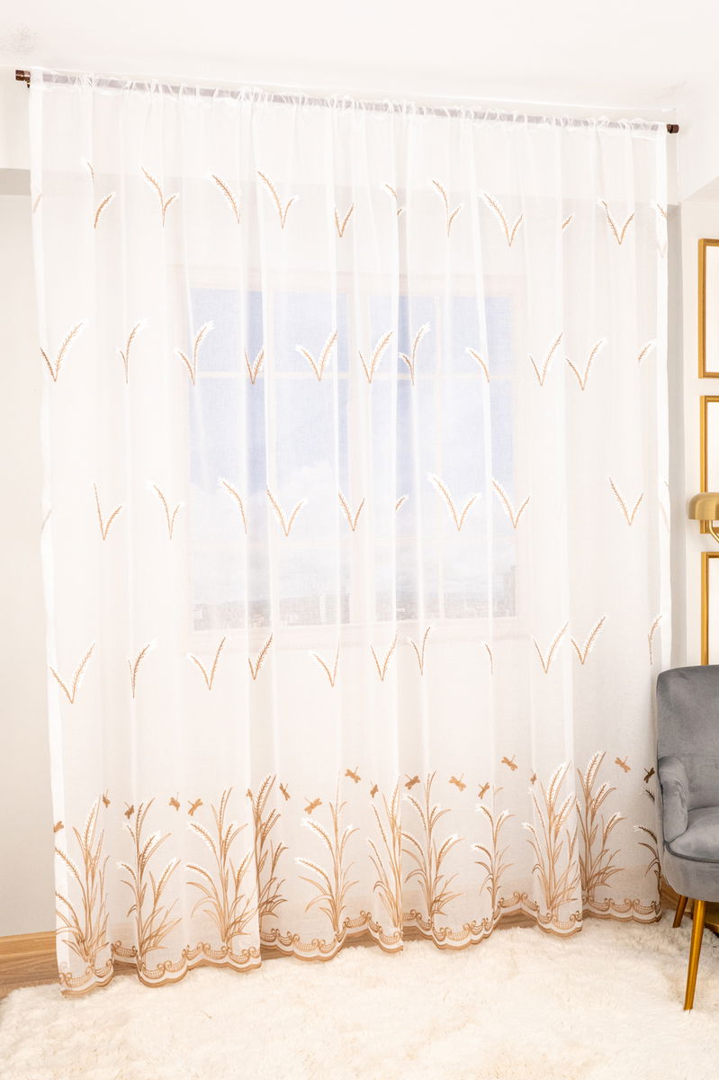 Alege Perdelele Realizate la Comanda la dimensiunile alese de tine, pentru ca meriti o casa mai frumoasa! Cauti acel detaliu special care sa aduca viata si personalitate casei tale? Perdelele noastre sunt raspunsul perfect. Cu o gama variata de culori, texturi si stiluri, poti sa-ti personalizezi spatiul asa cum doresti. Fie ca iti doresti mai multa intimitate, sa reglezi lumina naturala sau sa adaugi un element de design elegant, perdelele noastre sunt alegerea potrivita. Aceasta perdea eleganta adauga rafinament si stil locuintei tale, oferind, in acelasi timp, functionalitate si un ambient placut. Descopera detaliile si caracteristicile acestei perdele deosebite. Detalii privind produsulPerdea Realizata la Comanda la dimensiunile alese de tine. Latime: Poate fi aleasa in functie de dimensiunea dorita de tine. In functie de cat de incretita iti doresti perdeaua, recomandarea noastra este minim 2x dimensiunea galeriei sau a sinei.   Inaltime: Poate fi aleasa in functie de inaltimea camerei, dar nu mai mare de 2.7 metri. Pot fi exceptii la perdelele fara model sau imprimeu (matase, voal, in). In cazul in care doriti o alta dimensiune, anuntati-ne si incercam sa va ajutam. Textura Tip: In cu Broderie Compozitie Material: 100% Microfibra Sistem de Prindere: Galerie (Bara), Sina (folosind clestisori - nu sunt inclusi)Rejansa: In functie de preferinte. Vezi detaliile de la fiecare tip de prindere de mai sus.  Bine de stiut:Locuri Recomandate de Utilizare: Aceasta perdea este potrivita pentru living, dormitor sau oricare alt spatiu in care doresti sa aduci o nota de eleganta.Prindere si Incretire: Perdelele sunt gata lucrate. Sistemul de prindere poate fi Multifunctional (in functie de optiunile alese de tine, fiind compatibil cu galerii (bare) sau sine, oferindu-ti optiuni variate pentru montare).Compozitie Material: Realizata din 100% microfibra, aceasta perdea este fina si rezistenta in acelasi timp.Recomandare: Inainte de prima utilizare, este recomandata spalarea perdelei cu grija pentru a mentine aspectul sau deosebit.Spalare: Poate fi spalata la masina, program scurt, la maximum 30 de grade Celsius.Ingrijire: Nu se utilizeaza inalbitori. Nu se usuca la uscator. Se calca la temperatura normala cu abur. Livrare: Perdelele si draperiile la comanda sunt produse personalizate, lucrate special pentru tine, astfel, in majoritatea cazurilor nu vor ajunge a doua zi, dar tot le vei primi rapid, livrarea pentru ele se face in aproximativ 2-4 zile lucratoare. Ca sa stii mai concret cat de aproape sunt de tine, vei primi un mesaj cand sunt pregatite sa porneasca spre tine, iar incepand cu urmatoarea zi vor fi in procesul de livrare.Important: Responsabilitatea de a masura si a ne furniza dimensiunile corecte este a ta, noi te vom suna dupa plasarea comenzii pentru a confirma inca o data dimensiunile produselor pentru ca, nu putem primi inapoi produsele personalitate realizate la comanda special pentru tine. Noi lucram perdelele si draperiile cu dimensiunile pe care ni le dai, cele trecute in formularul de comanda si confirmate telefonic sunt cele finale care vor ajunge la tine. Ne dorim sa fim cât mai aproape de dimensiunile date de tine, dar lucrând cu dimensiuni mici (centimetri, milimetri) este important sa stii ca marja de eroare pe care o avem este de +/- 5 cm.Nota: Pozele afisate sunt cu titlu de prezentare si au scop comercial. Pot exista mici diferente de nuanta si de incadrare a imprimeului. Pozele sunt realizate de catre noi, in Atelierul Harnicutei.