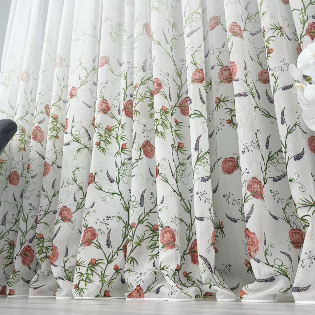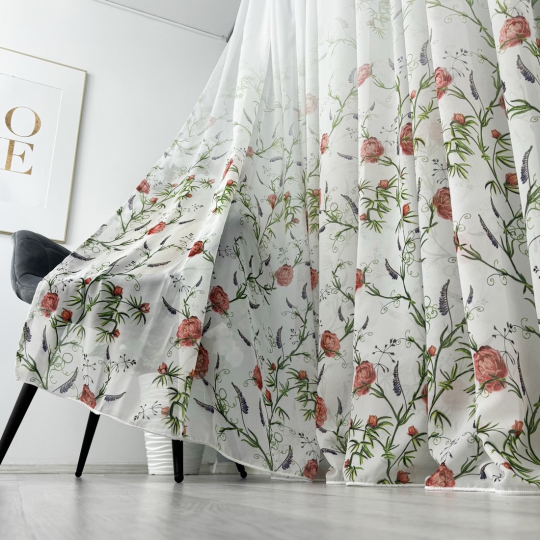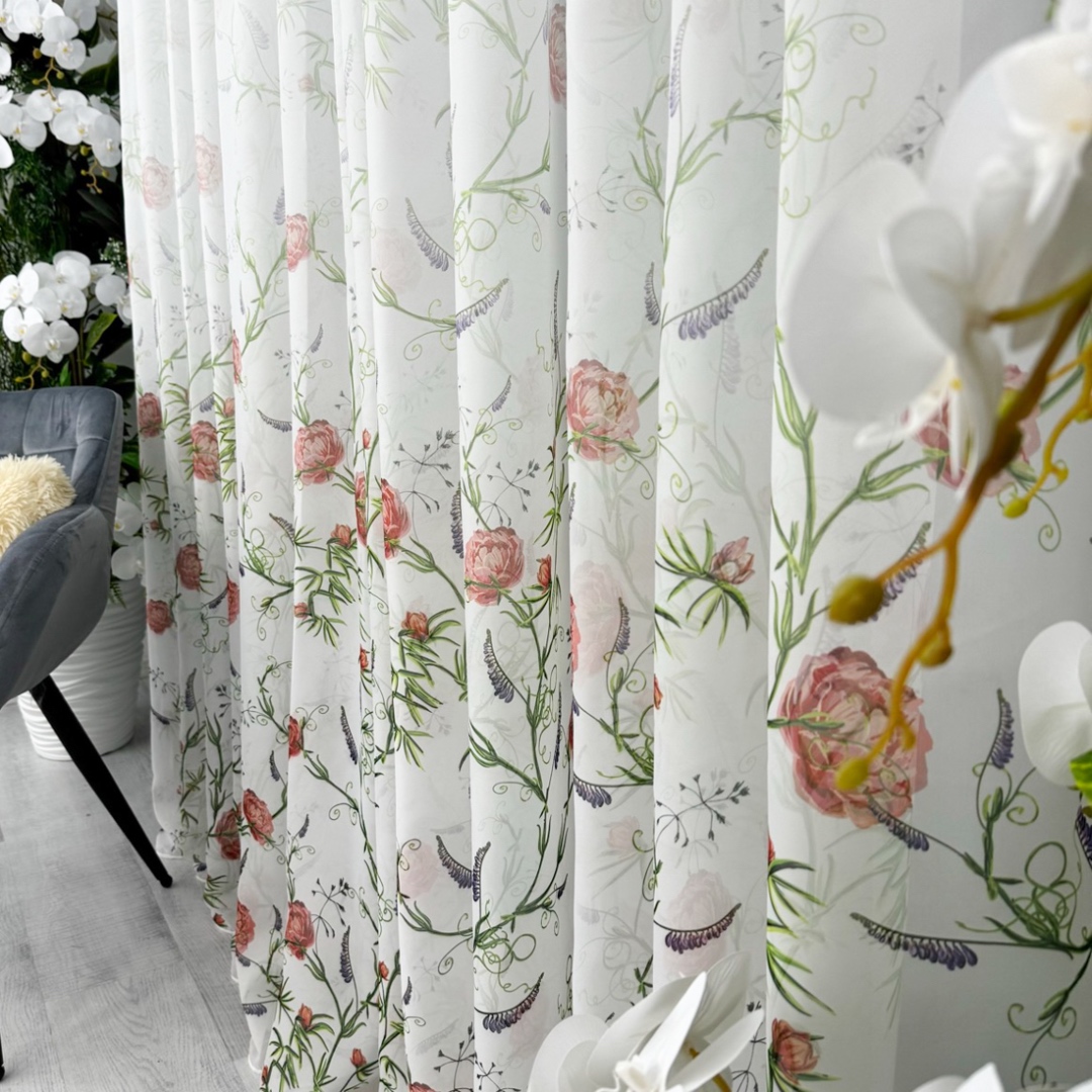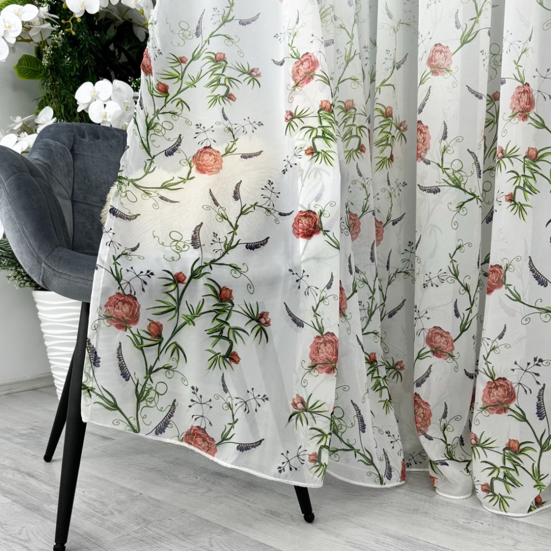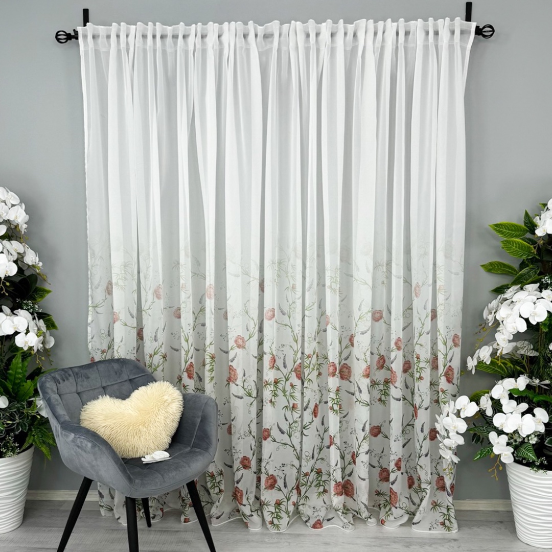 Perdea din Voal imprimat, Alb, model floral, 140cm latime x 260cm inaltime, cu rejansa pt bara
