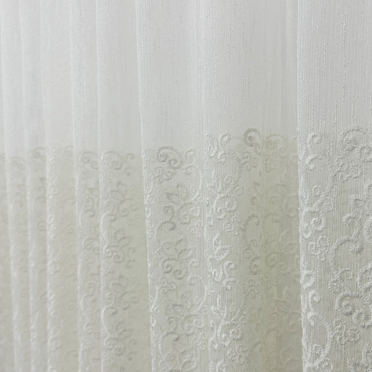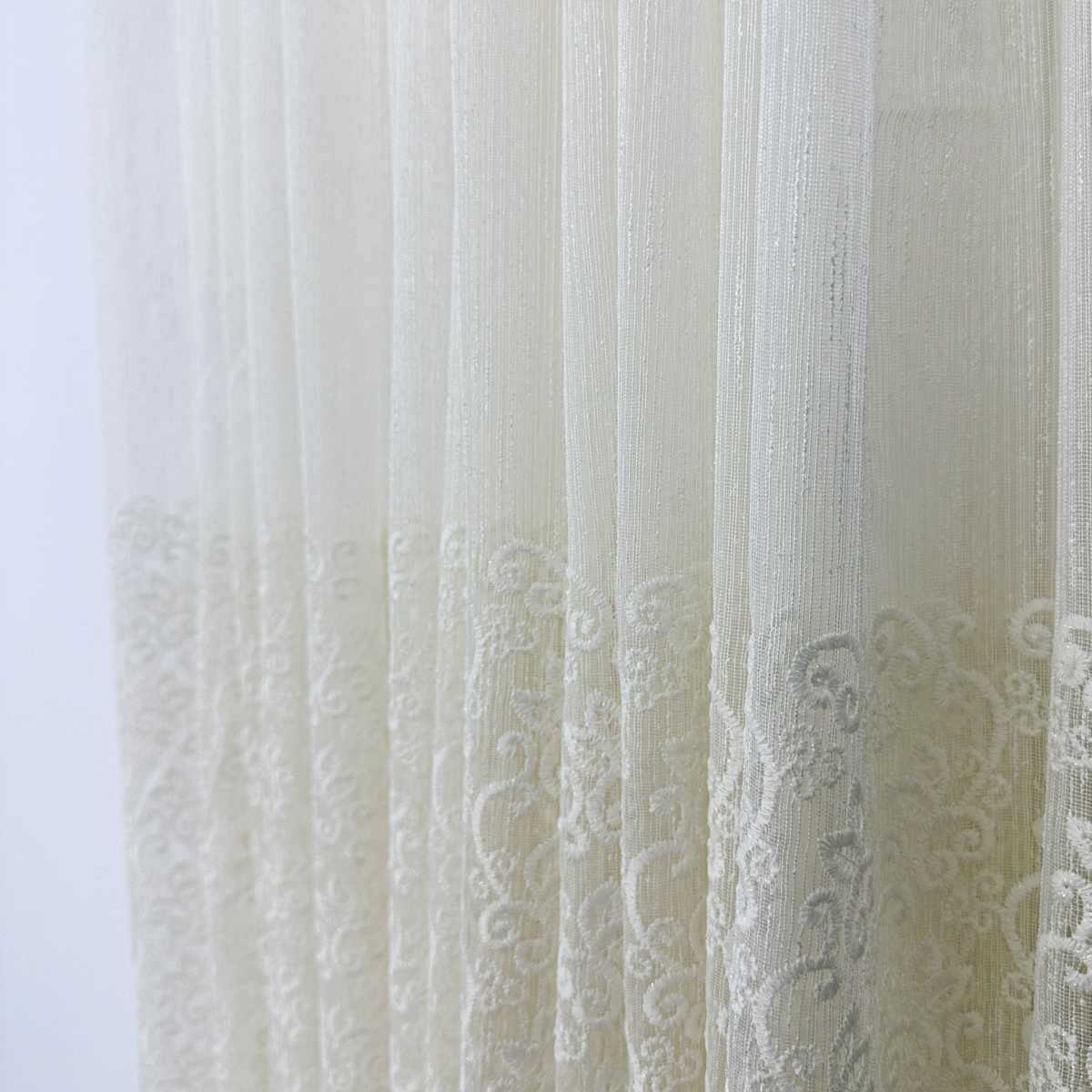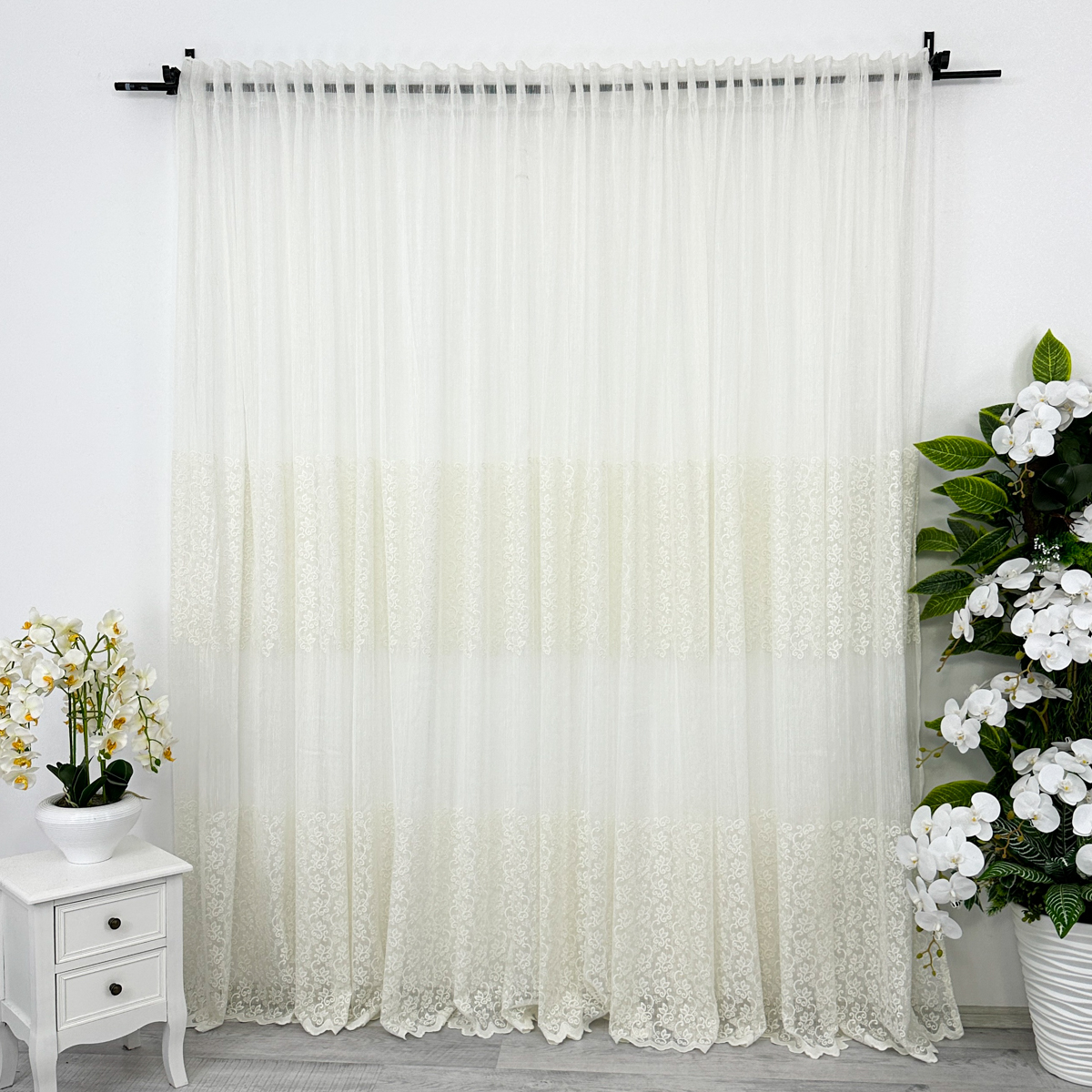 Perdea cu textura tip in cu broderie, dimensiune standard, cu rejansa pt bara. COMPOZITIA MATERIALULUI: 100% poliester CONTINUTUL PACHETULUI: perdea, pe dimensiune standard - 1 bucata 140x260cm.INTRETINEREA PRODUSULUI: Se spala la max. 30°C si se calca la temperatura normala, cu abur. Nu se recomanda spalarea cu inalbitori chimici si nici uscarea prin centrifugare. Inainte de prima utilizare, recomandam spalarea draperiilor, pentru a elimina eventualele impuritati si urme de praf. SIS