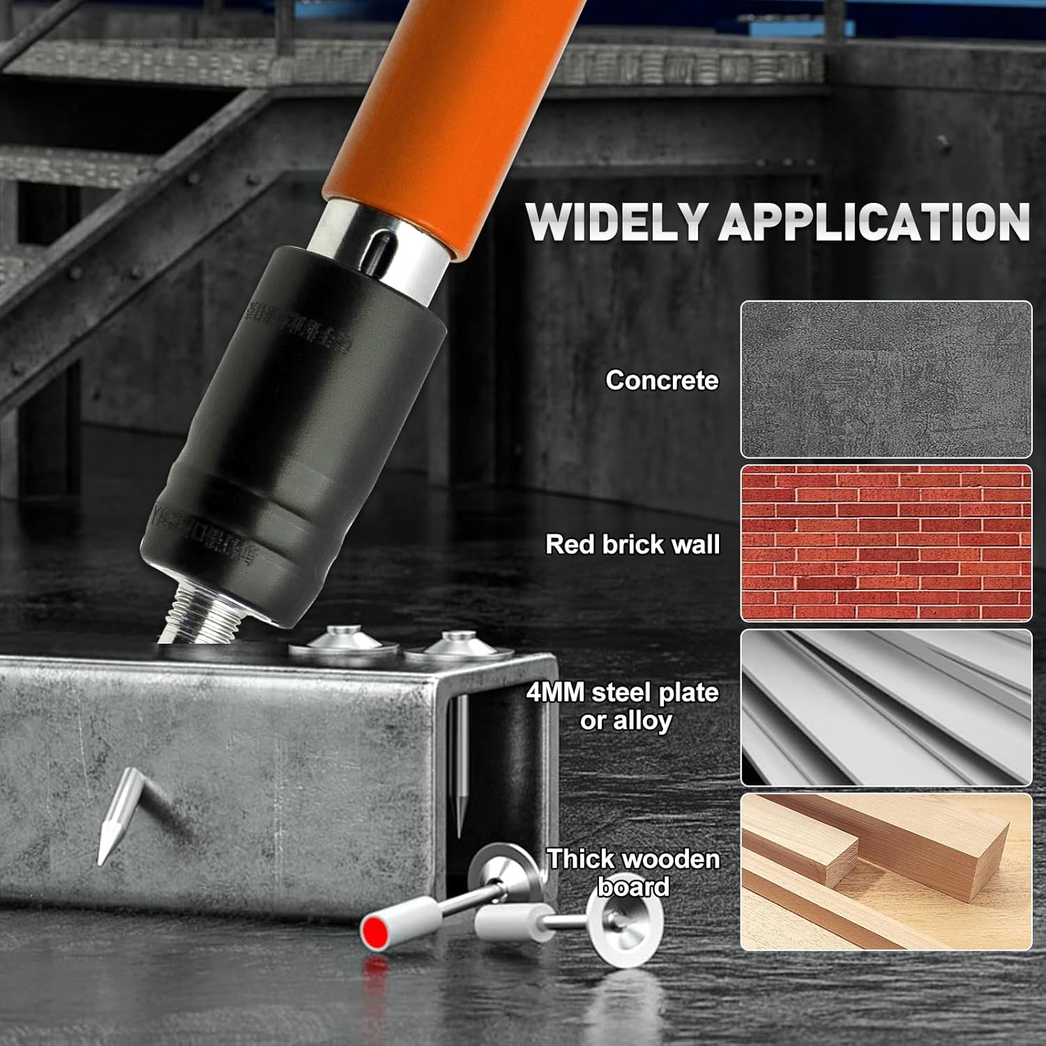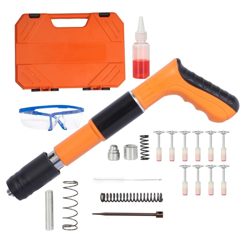 Pistol pentru nituri, 50 de cuie Pentru ziduri de beton si caramida, scule multifunctionale Pachetul include: pistol de cuie de beton 50 bucati de cuie rotunde cutie de plastic ochelari de protectie cheie, perie manual Usor de utilizat, doar cinci pasi simpli: 1. Purtati ochelari de protectie, manusi si dopuri de urechi; 2. Alege unghia; 3. Pistol de cuie vertical la locul de munca gata de trage; 4. Forta verticala in perete; 5. Tineti capacul tobei de esapament si comprimati-l de mai multe ori. Daca apare nu poate functiona, va rugam sa stergeti reziduul inainte de a incerca cateva unghii. Amortizor dublu si indepartare convenabila a zgurii: Acest mini pistol de cuie care utilizeaza otel ingrosat si gauri de amortizor de cauciuc de inalta calitate, a fost testat de mii de ori, reducand zgomotul, nu deranjeaza oamenii si facand mediul de constructie mai confortabil. Aplicatii pe scara larga: Pistolul de cuie de beton cu forta de penetrare puternica, Folosind percutor integrat ingrosat de inalta rezistenta, nu este usor de spart sau blocat, prelungind durata de viata, pistolul de cuie pentru beton dureaza doar 0,1 s pentru a perfora o placa de otel de 3 mm intr-o singura. Acest pistol de cuie este potrivit pentru lungimi de cuie: cuie de 25 mm. Este potrivit pentru instalarea camerei, instalarea cutiei electrice, instalarea apei si a energiei electrice, instalarea aerului conditionat si rama agatata, raftul multifunctional, cutia de jonctiune mica, instalarea conductelor, legarea sarmei etc.
