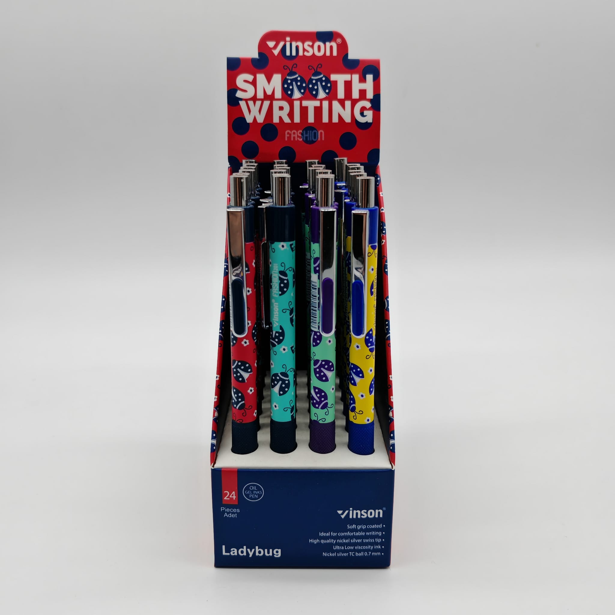 Pixul mecanic Inson Ladybug este alegerea perfectă pentru o scriere fluidă, confortabilă și de înaltă calitate. Cu un design modern și atractiv, acest pix combină estetică plăcută cu funcționalitatea excelentă. Gripul cauciucat antiderapant oferă un confort deosebit, chiar și în timpul utilizării îndelungate, iar cerneala gel pe bază de siguranță asigură o scriere lină și intensă, fără riscul de a se estompa sau de a lăsa urme. Setul conține 24 de pixuri ideale pentru utilizare zilnică în birouri, școli, universități sau pentru orice activitate ce necesită o scriere precisă. Fiecare pix este dotat cu o mina de 0.7 mm, care permite detalii clare și precise în orice situație. Datorită mecanismului retractabil, pixul Inson Ladybug este ușor de transport și protejează mina de rupere. Caracteristici ale produsului: Set de 24 pixuri mecanice cu gel, 0.7 mm Grip cauciucat antiderapant pentru confort sporit și control excelent Cerneală gel pe bază de apă, uscare rapidă și fără smudging Mecanism retractabil pentru protecția minei și transport ușor Design modern și ergonomic, ideal pentru utilizare îndelungată Ideal pentru scriere precisă, notițe, corecturi și evidențiere Avantaje pentru vânzare en-gros: Preț competitiv pentru cereri în volum – perfect pentru revânzători Produs de uz frecvent în birouri, școli, instituții comerciale și uz personal Ambalare convenabilă, ușor de distribuit sau vândut individual Ideal pentru bibliotecă, magazine de papetarie, platforme online și distribuitori de birotică Alege pixul mecanic Inson Ladybug cu gel și cauciuc antiderapant – performanță și confort într-un design elegant, disponibil acum în set de 24 de bucăți, la un preț avantajos pentru vânzare în-gros!
