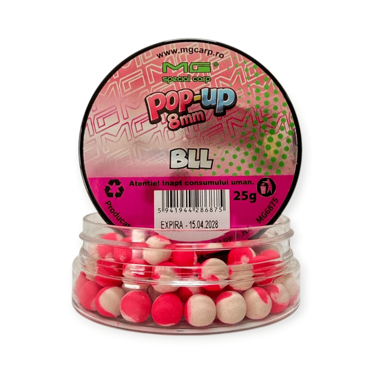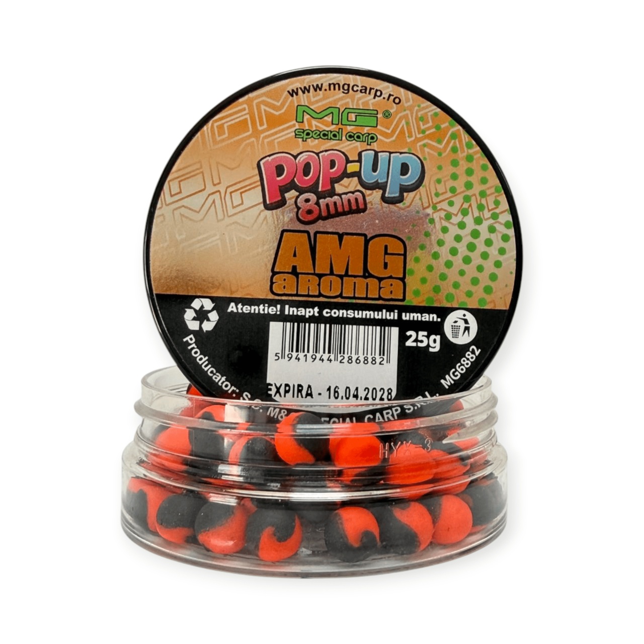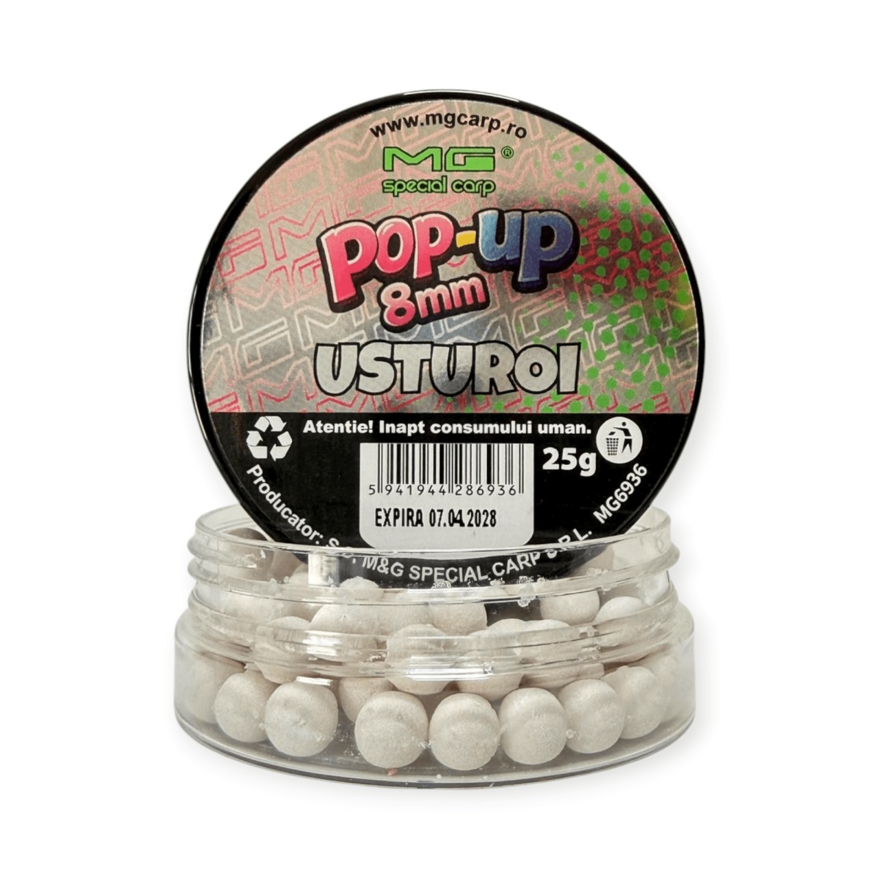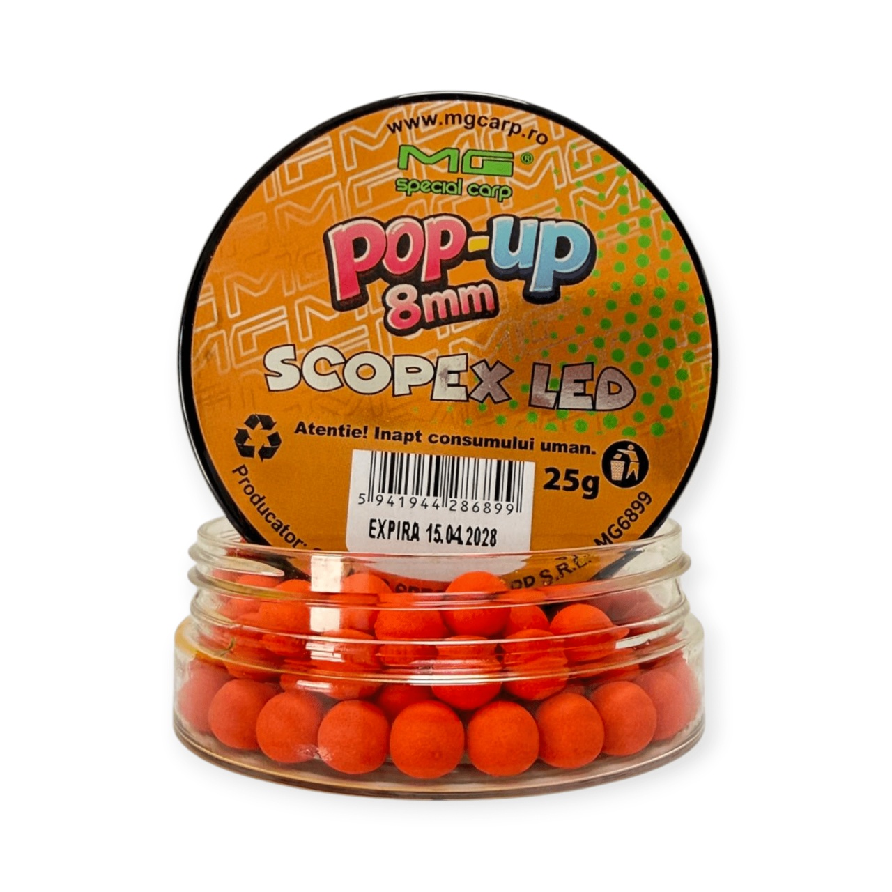 Pop-up-urile MG Special Carp sunt momeli de cârlig flotante , dezvoltate pentru pescuitul la crap și caras , în special în stilul de pescuit pe viteză sau în situații în care este nevoie de o prezentare extrem de vizibilă și atractivă. Datorită conținutului ridicat de arome, atractanți și aditivi lichizi și praf , aceste pop-up-uri generează un semnal puternic de hrănire , fiind eficiente atât în combinație cu nadă, cât și în pescuit izolat (plumb + sac solubil). Nu sunt destinate nădirii, ci exclusiv utilizării ca momeală de cârlig . Structura este bazată pe un mix de ingrediente flotante precum cazeinat, lapte praf, făină de soia și WPC , completate de o fază lichidă cu ou, aromă și atractanți. Rezultatul este o momeală cu flotabilitate ridicată și de durată , capabilă să rămână activă în apă până la 24 de ore . Se pot monta pe spin-uri pentru pop-up, anouri sau fir de păr , iar pentru o funcționare corectă este recomandată echilibrarea monturii (cu tungsten, alice sau cârlig potrivit), pentru a evita ridicarea excesivă a acesteia. Caracteristici ? Tip produs: pop-up (momeală flotantă) ? Specii vizate: crap, caras ⚖️ Flotabilitate: ridicată, de lungă durată (până la 24h) ? Compoziție: cazeinat, lapte praf, soia, WPC, ou, arome ⚡ Efect: atracție puternică și vizibilitate crescută ? Utilizare: pescuit pe viteză, method feeder, pescuit izolat Montaj: spin, anou sau fir de păr ⚠️ Important: necesită echilibrare montură Specificații ? Dimensiune: 8 mm ⚖️ Cantitate: 25 g ? Ambalare: flacon Atenționări ? Produs necomestibil ? A nu se lăsa la îndemâna copiilor ⚕️ În caz de ingerare accidentală, consultați medicul