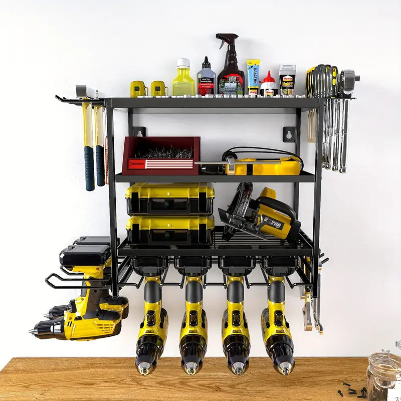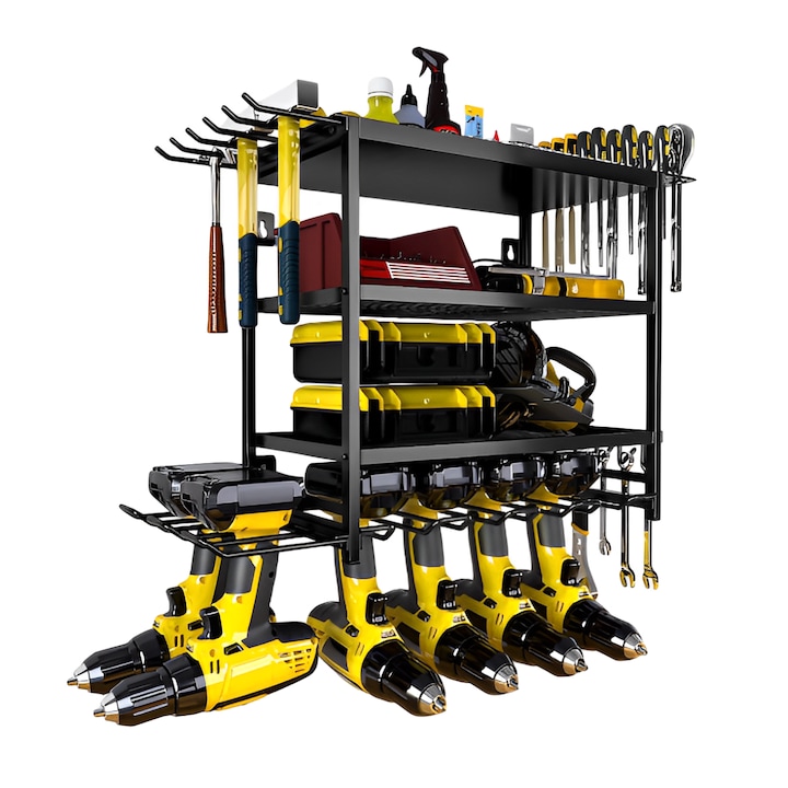 Raft metalic pentru scule si unelte, 4 compartimente Montare pe perete, carlige pentru agatare, negru Dimensiuni produs: 60 x 41.5 x 24.5 cm Organizator pentru scule cu 4 niveluri, design modern minimalist, montat pe perete, multifunctional. Organizatorul nostru pentru scule de garaj, montat pe perete, are un design imbunatatit cu 4 niveluri, oferind o solutie practica si eleganta pentru depozitarea sculelor. Capacitate generoasa de depozitare: Designul imbunatatit cu 4 niveluri ofera spatiu suficient pentru a pastra toate sculele intr-un loc ordonat si usor accesibil. Constructie robusta - Acest raft pentru scule este realizat din metal compact de inalta rezistenta, cu articulatii intarite pentru stabilitate sporita. Testele de rezistenta confirma ca rafturile noastre pot suporta cu usurinta greutatea sculelor electrice. Instalare simpla: Montarea rafturilor noastre de garaj este extrem de usoara. Conectati specificatiile sarmei de otel si ale stratului de acoperire cu suruburi, apoi montati-l direct pe perete. Durabilitate pe termen lung: Raftul nostru pentru scule electrice este acoperit cu o vopsea mata rezistenta la temperaturi inalte si are suprafete lustruite, ceea ce il face rezistent la rugina si zgarieturi, mentinandu-l functional si atractiv timp de ani de zile. Gestionare organizata a sculelor: Pastrati spatiul de lucru ordonat si eficient cu organizatorul nostru de scule, proiectat profesional pentru a maximiza spatiul de depozitare si pentru a imbunatati vizibilitatea si accesibilitatea tuturor sculelor importante dintr-o privire. Design modern si minimalist: Perfect pentru garaje, ateliere sau orice spatiu de lucru Combina functionalitatea cu un aspect estetic placut Materiale si finisaje de calitate Metal rezistent si durabil Acoperire mata antirugina si antizgarieturi Continutul ambalajului: Organizator cu 4 niveluripentru scule Accesorii necesare pentru montaj