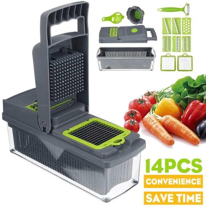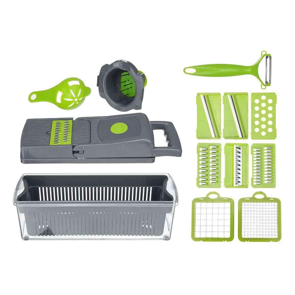 Razatoare Veggie Slicer 14 piese Esti obosit si te-ai saturat de taierea si taierea lucrarilor de preparare a gatitului? Razatoare multifunctionala este perfect pentru pregatirea cepei, a salatelor, a usturoiului si a mai multor legume si fructe. Pachetul include: capac protectie mana separator de oua lame tip cuburi 14 x 14 mm lame tip cuburi 7 x 7 mm razatoare grosiera de branza razatoare 4 mm razatoare 3 mm feliator 1.5 mm feliator 1 mm feliator stil onduleu curatator de legume cutie transparenta depozitare sita/cos de scurgere dispozitiv de feliere/ras Lame inter-schimbabile satisface nevoia ta in bucatarie Cireasa de legume va permite sa abordati toate nevoile dvs. de taiere, taiere si gratare cu doar 1 instrument de bucatarie. Trateaza-ti familia la o masa sanatoasa. Proiectat pentru siguranta si durabilitate - Lamele noastre Food Chopper sunt fabricate din otel inoxidabil, astfel incat sa-si pastreze felia de limpezime a rasului dupa felie. Plasticul fara BPA se potriveste tuturor masinii de spalat vase pentru a facilita curatarea. Pentru siguranta ta, aceasta felie de legume vine cu o protectie de mana, astfel incat degetele sa nu fie niciodata expuse lamelor. Faceti-va pregatirea pentru masa rapid si eficient - Tocatorul si razatoarea cu felie va permite sa serviti taitei sanatosi pentru legume, sa va rumenati branzeturile proprii pentru salate si paste si sa feliati legumele proaspete intr-un timp record. Ceapa se taie repede, felia de branza doar in cateva secunde. Vine cu un cadou: cosul de scurgere - Tocatorul de ceapa include un cos de scurgere si un recipient mare, astfel incat sa puteti spala legumele si fructele direct dupa taiere si feliere.