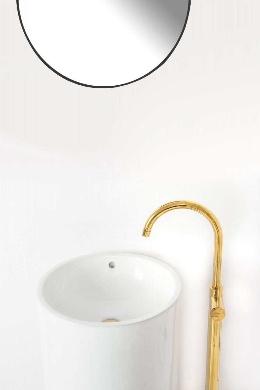 Bateria modernă și funcțională aurie impresionează prin designul său neobișnuit. Va umple perfect spațiul băii. Produsul este fabricat din alamă acoperită cu un strat auriu. Bateria este foarte durabilă și ușor de curățat. Robinetele independente sunt o opțiune modernă și elegantă pentru a plasa baterii în fiecare baie. Este o alternativă interesantă la robinetele montate în pereți și pe marginile lavoarelor. Sunt perfecte pentru băi mai mari, servind nu numai un rol pur funcțional, ci și decorativ. În combinație cu un frumos lavoar de sine stătător, care se potrivește cu designul la robinet, creează un efect vizual perfect. Capetele din ceramică garantează o durată lungă de viață.