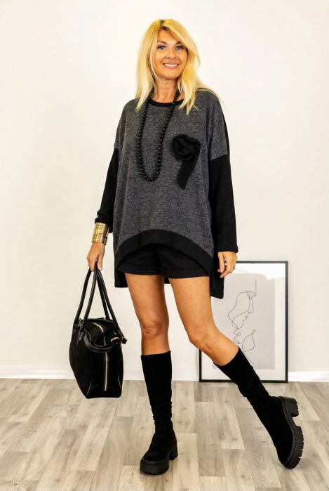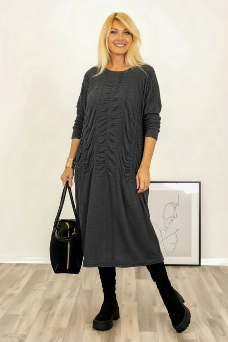 Are maneci 3 4 ce se pot ridica si prinde cu un nasturel Are decolteu in V rotunjit Are o cusatura de elastic sub sani,pentru evidentierea siluetei Are doua snururi di acelasi material ce se leaga la spate pentru a evidentia silueta Are doua buzunare...