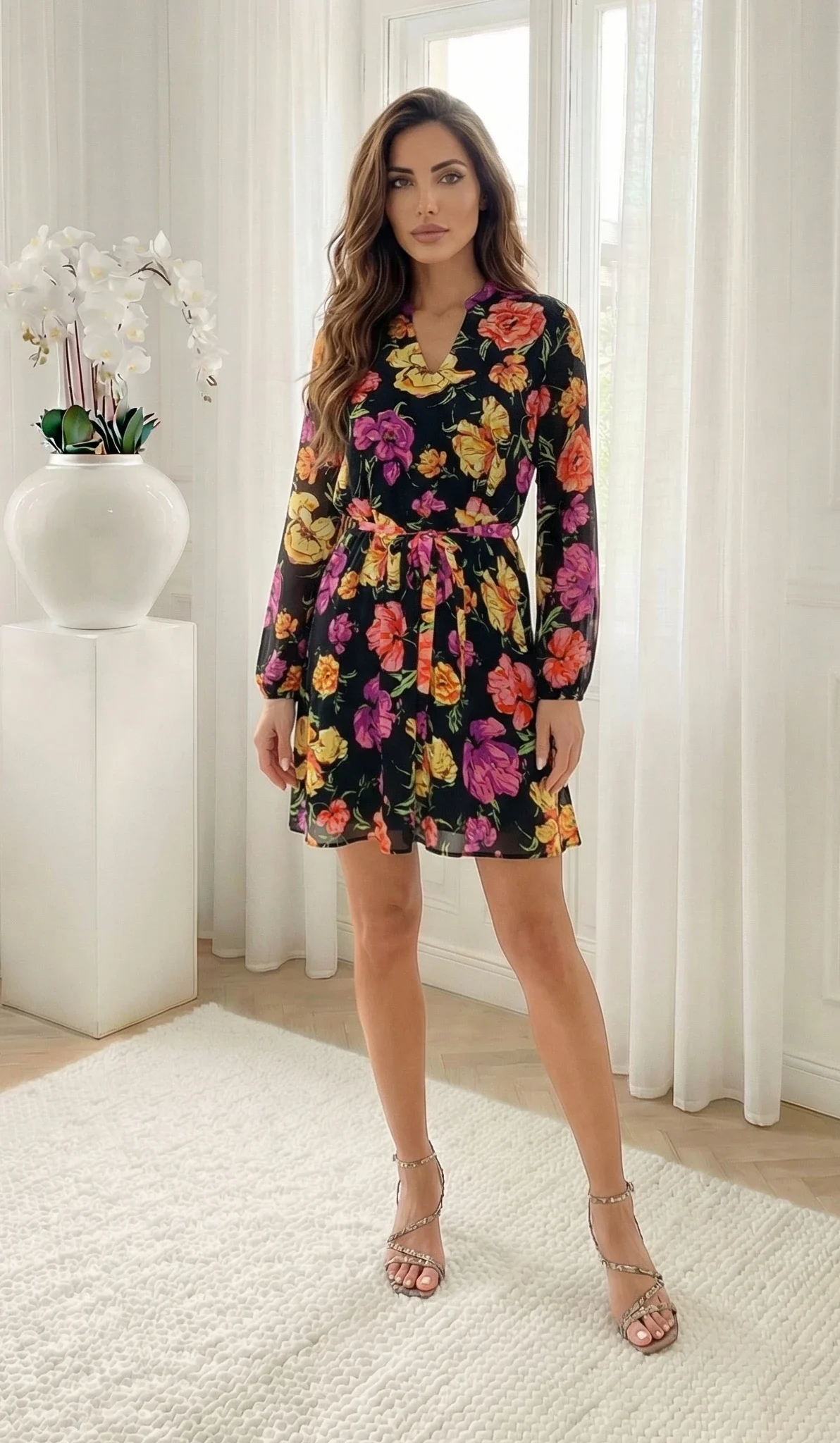 Rochie scurta vaporoasa cu imprimeu floral si cordon in talie, alegerea perfecta pentru o aparitie plina de prospetime si eleganta, fiind o piesa versatila ce emana feminitate. Aceasta rochie dispune de o captuseala interioara fina care asigura opacitate