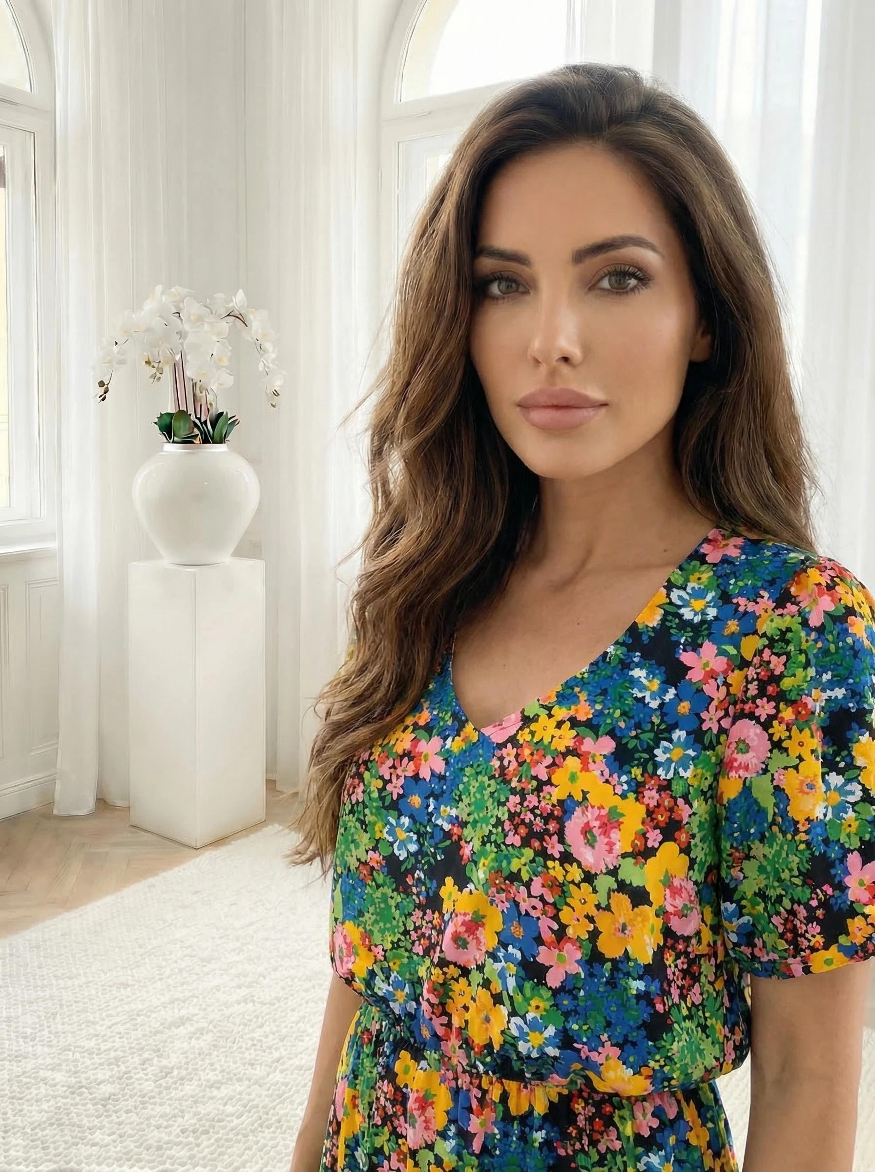 Rochie scurta vaporoasa cu imprimeu floral multicolor, o piesa plina de energie si veselie, ideala pentru zilele insorite sau plimbarile relaxate. Aceasta rochie se remarca prin imprimeul floral dens si vibrant, ce imbina nuante de galben, roz, albastru s