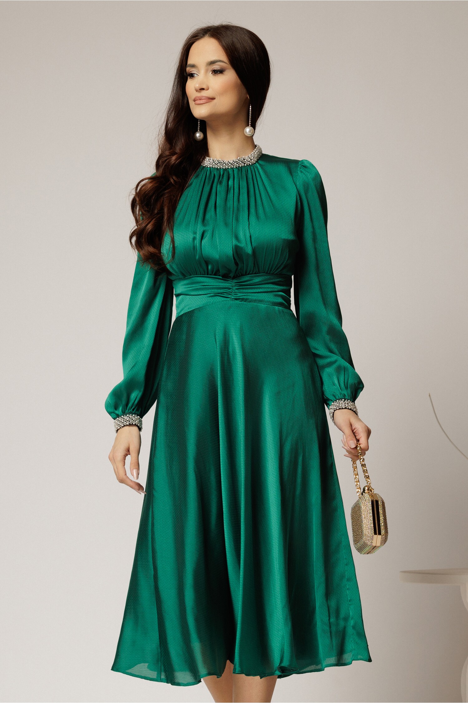 Este o rochie scurta de ocazie de culoare verde, cu aplicatii la decolteu si buzunare false accesorizate cu pietricele. rochie scurta verde de ocazie aplicatii la decolteu maneca lunga buzunare false cu clapete si pietricele fusta tip A inchidere cu fermoar la spate fara captuseala Material: stofa Compozitie: 92% poliester, 8% elastan Fotomodelul poartă mărimea: S | Înălțime: 173 cm Fiecare produs este măsurat individual. Te rugăm să consulți ghidul de mărimi pentru alegerea corectă a mărimii!