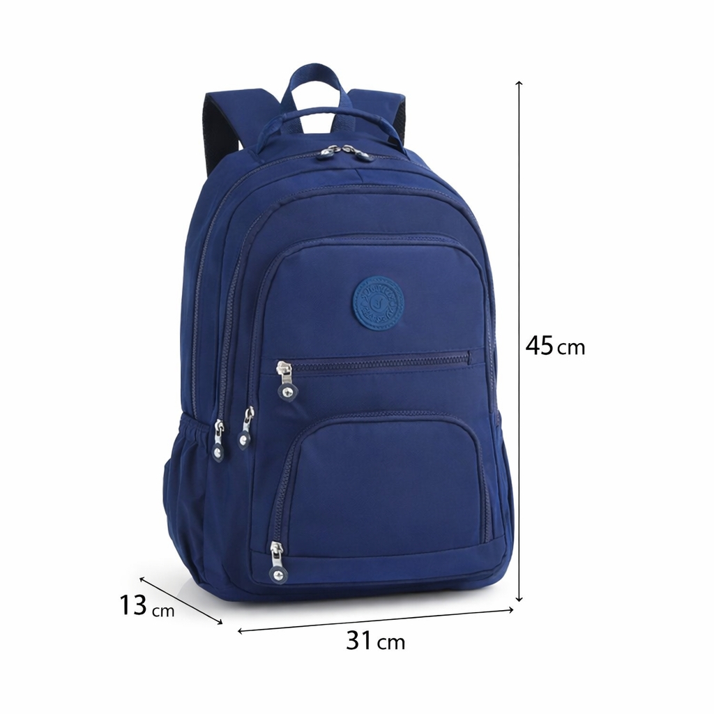 interior captusit; 1 compartiment principal; 1 buzunar interior fara inchidere; 1 buzunar interior cu fermoar; 3 buzunare exterioare fata cu fermoar; 1 buzunar exterior spate cu fermoar; 2 buzunare laterale cu elastic; bretele ajustabile; material: poliester impermeabil; sistem inchidere: fermoar; dimensiuni: 31 x 13 x 45 cm; greutate: 0.6 kg; accesorii de culoare neagra. Important: Nuanta produsului poate varia usor, datorita luminozitatii monitorului, datorita varietatilor instrumentelor de masura, pot exista usoare erori de cm!