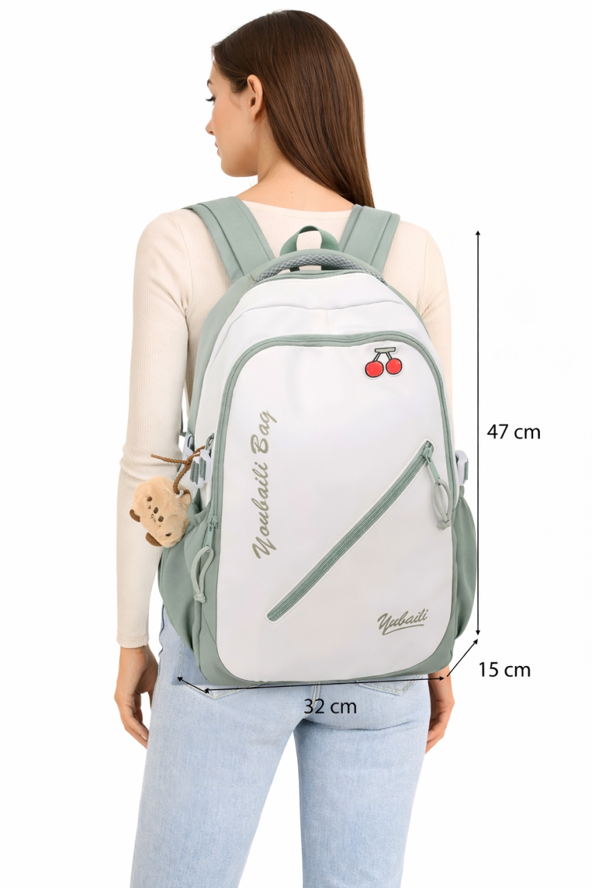 interior captusit; 1 compartiment principal; 1 buzunar interior fara inchidere; 2 buzunare exterioare fata cu fermoar; 1 buzunar exterior spate cu fermoar; 2 buzunare laterale; bretele ajustabile; material: poliester impermeabil; sistem inchidere: fermoar; dimensiuni: 32 x 15 x 47 cm; greutate: 0.7 kg; accesorii metalice de culoare rosie. Important: Nuanta produsului poate varia usor, datorita luminozitatii monitorului, datorita varietatilor instrumentelor de masura, pot exista usoare erori de cm!