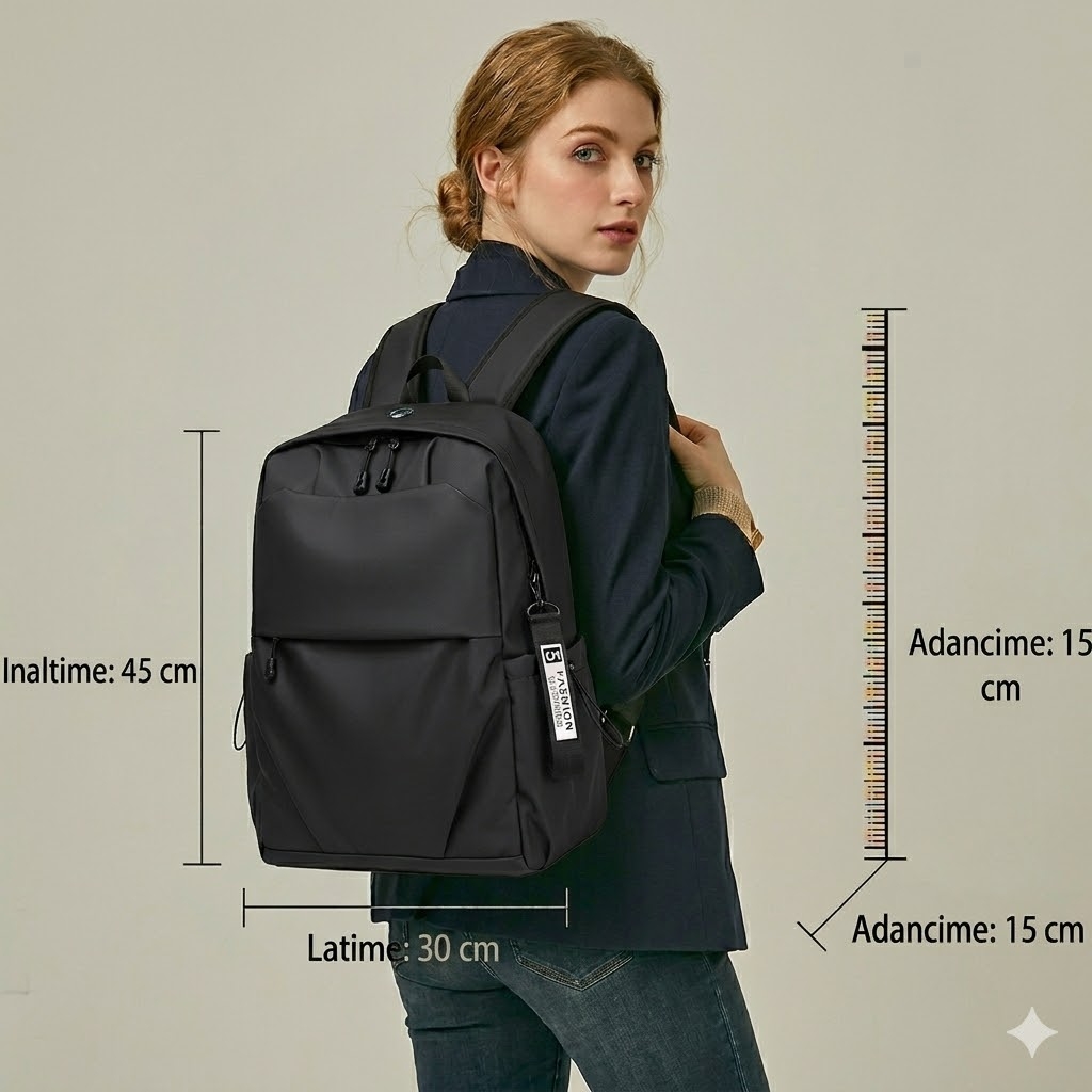 Detalii produs: 1 compartiment principal: 1 buzunar fata exterior; 1 bununar pentru laptop; 2 buzunare laterale exterioare fara inchidere; barete ajustabile; material: nylon impermeabil; dimensiuni: 30 x 15 x 45 cm greutate: 0.4 kg; capacitate: 21 L. Excelent pentru călătorii, cumpărături, școală și ieșiri! Suficient spațiu pentru cele mai importante articole, cum ar fi telefonul, portofelul, cheile și produsele cosmetice. Geanta este suficient de mare pentru a pune articole A4, sticla de apa, umbrela, dispozitive digitale precum blocnotes, tableta, kindle, power bank etc. Important: Nuanta produsului poate varia usor, datorita luminozitatii monitorului, datorita varietatilor instrumentelor de masura, pot exista usoare erori de cm!