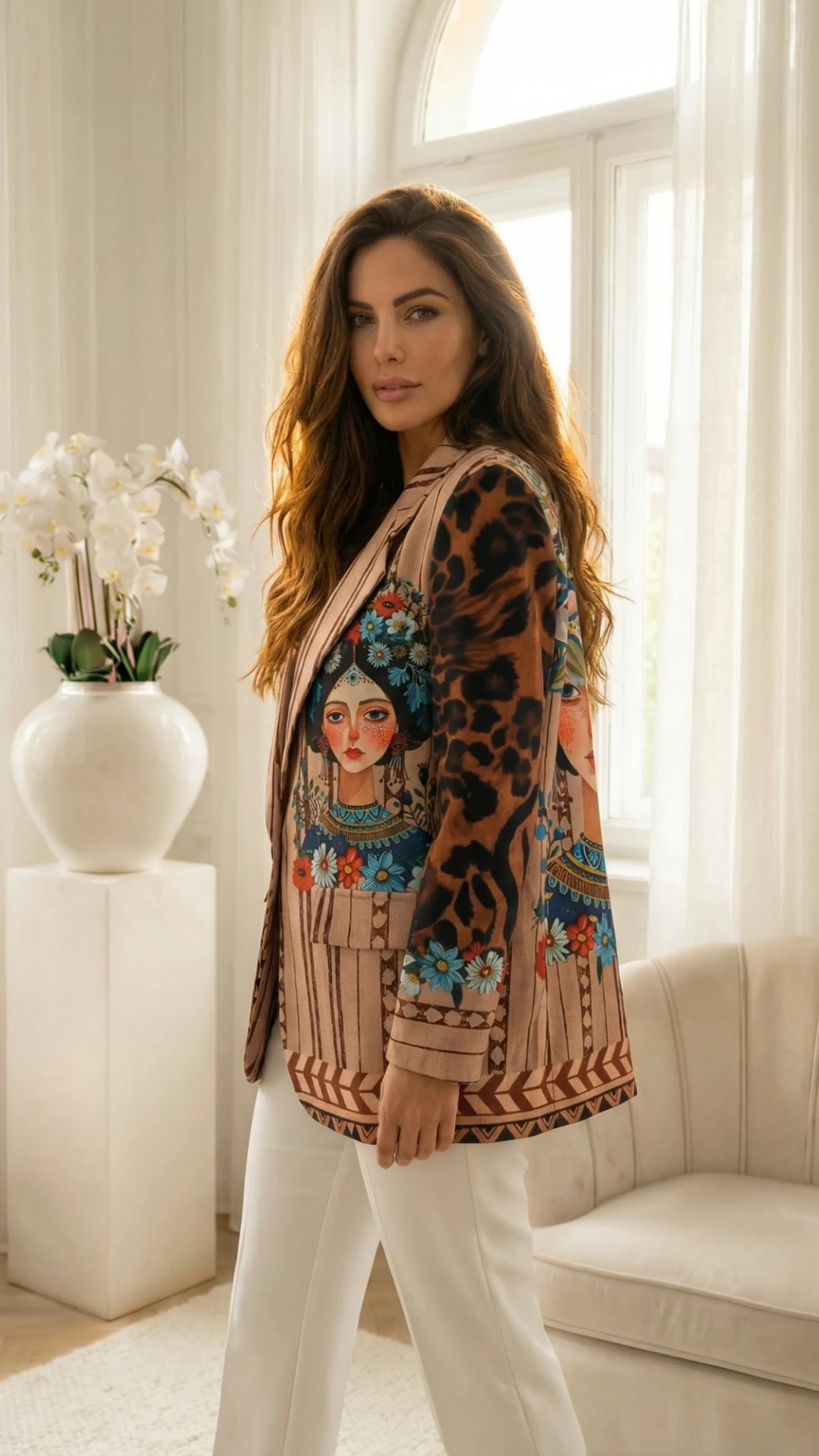 Sacou maro cu dungi verticale si imprimeu artistic portret, o fuziune fascinanta intre stilul clasic si cel avangardist, fiind conceput pentru a deveni punctul central al oricarei aparitii. Piesa se distinge prin contrastul puternic dintre baza maro cu du