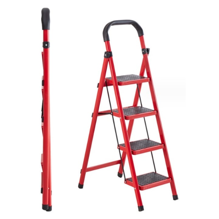 Scara pliabila din metal, 4 trepte late, 150 kg, Rosu-Negru Scara pliabila metalica, cu 2 trepte late ce dispun de o suprafata striata antialunecare. Manerul superior este buretat pentru evitarea zgarieriei peretilor sau mobilei, iar picioarele sunt protejate cu capacele antialunecare din silicon. Caracteristici si specificatii: Dispune de separatoare intre trepte Scara pentru uz casnic cu cadrul din otel 2 trepte late pentru siguranta Este prevazuta cu picioruse din cauciuc Are o buna sustinere si cu trepte antiderapante Se poate plia pentru a fi usor de depozitat si manevrat Greutate maxima suportata: 150 kg Dimensiuni (pliata): Inaltime 143 cm x Latime 45 cm Treapta aproximativ: 35 cm lungime x 24 cm Latime