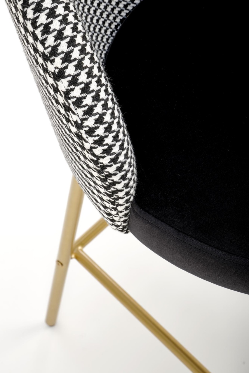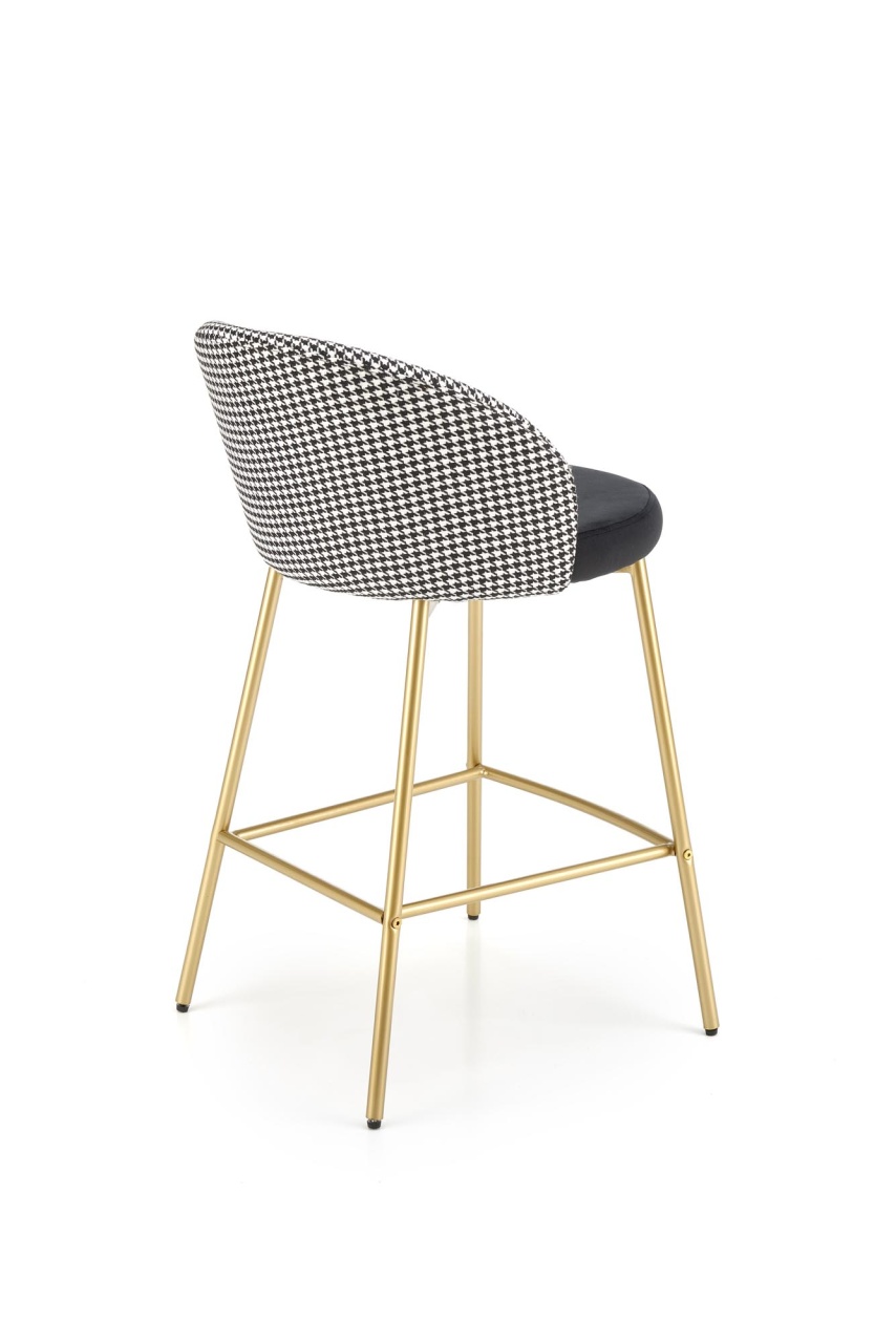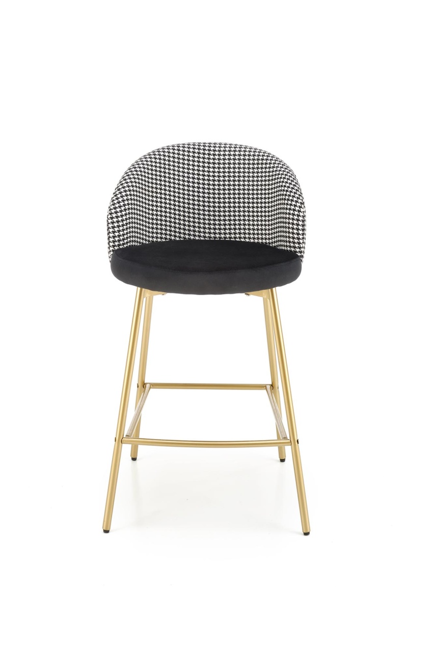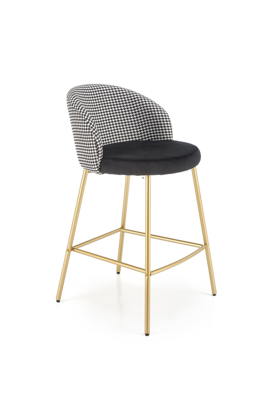 Scaun de bar tapitat H-113 alb/negru Scaun de bar tapitat H-113 alb/negru cu un design modern si sofisticat se va integra perfect in incinta restaurantului sau a barului dvs cat si acasa. Scaunul de bar este realizat cu grija la detalii, avand picioarele aurii si sezutul din catifea. Dimensiuni: 47 55 85 65 Latime: 47 cm Adancime: 55 cm Inaltime totala: 85 cm Inaltime de la sol la sezut: 65 cm Produsul nu este montat. Instructiunile de montaj se gasesc in colet.