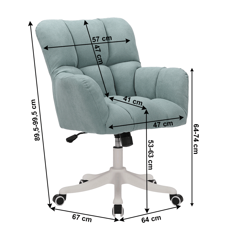 Material: plasticCuloare: alb Material tapiterie: tesatura Rezistenta la abraziune a tesaturii conform testului Martindale: 80.000 abraziuni Culoare: neomint Dimensiuni (LxIxH): 64x67x89,5-99,5 cmInaltimea reglabila a scaunului: 53-63 cmLatimea scaunului: 47 cmAdancimea scaunului: 41 cmInaltimea spatarului: 47 cmLatimea spatarului: 57 cmIncarcare maxima: 110 kgCu un piston Brate de sprijin Cusaturi decorative pe scaun si spatar Baza din plastic cu cinci brate Roti universale potrivite pentru orice tip de podeleFunctie de leagan