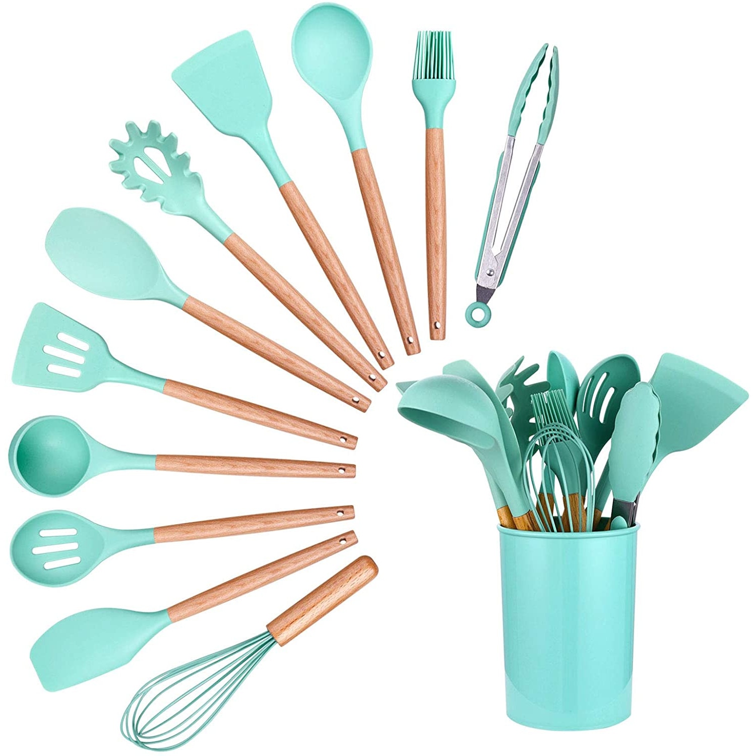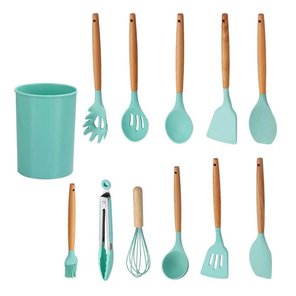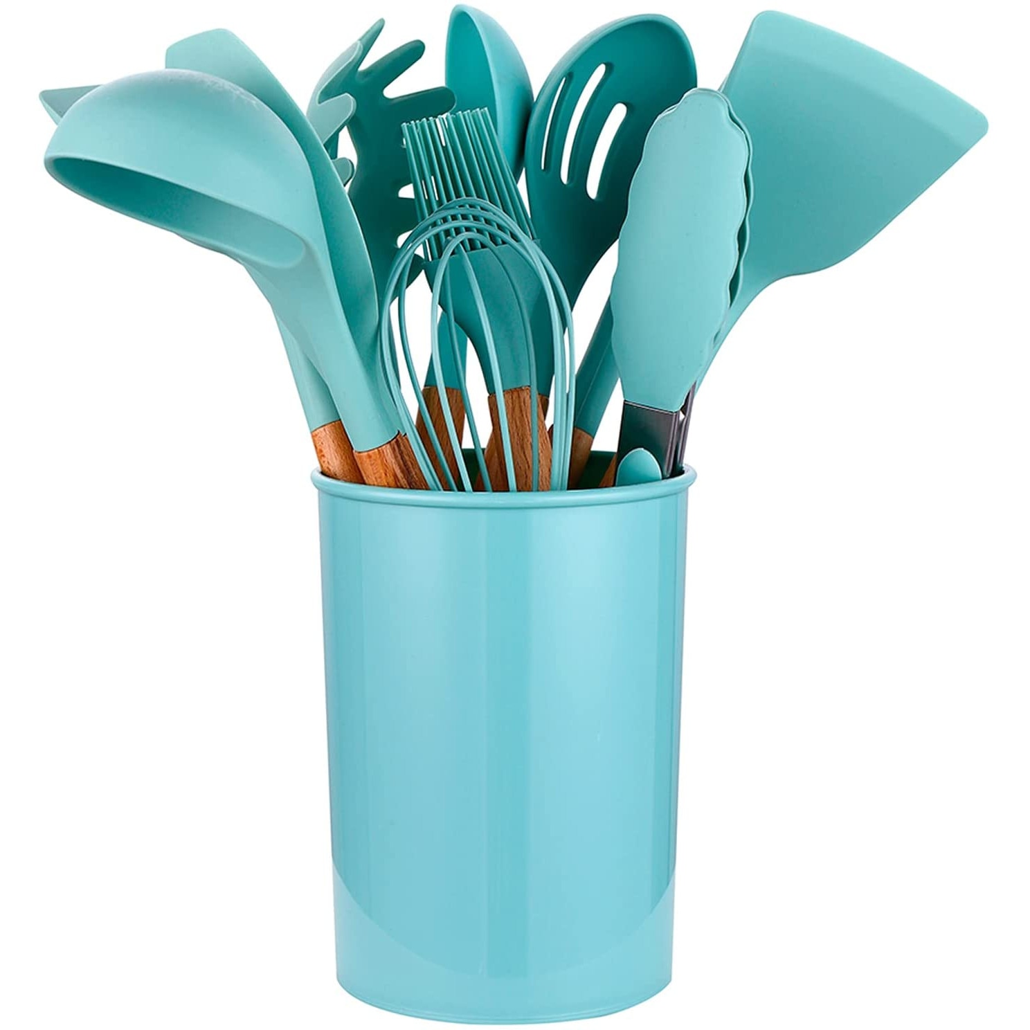 Set 11 ustensile din silicon, pentru gatit - Turcoaz 11 ustensile de bucatarie: Cleste, Tel, Pensula, Lingura cu fante, turner cu fante, Ustensila paste, Lingura, Spatula, Lingura, Turner solid, Ustensila de ciorba. Acest set va va satisface toate nevoile de gatit. SILICON ALIMENTAR - Siliconii de calitate alimentara pot rezista la temperaturi de 446 ° F / 230 ° C, daca le lasati accidental in oala pentru o perioada de timp, nu trebuie sa va faceti griji cu privire la topirea lor. Siliconii alimentari nu vor reactiona cu alimente sau bauturi si nu vor produce vapori periculosi. PROTEJATI CAPUL MASINII DE SPALAT VASE - Capul din silicon alimentar nu va zgaria sau deteriora tigaile antiaderente, tigaile metalice si ustensilele metalice. Acest lucru ii face foarte prietenosi atunci cand se ocupa de suprafete antiaderente. PROIECTARE SET ERGONOMIC - Setul nostru de ustensile de bucatarie din silicon este proiectat ergonomic si usor de utilizat. Fiecare recipient are o forma perfecta datorita functiei sale unice. In plus, puteti utiliza cosul de depozitare pentru a organiza si depozita ustensilele de gatit. USOR DE UTILIZAT SI DE CURATAT - Vesela din silicon este rezistenta la pete. Acest lucru se datoreaza naturii neporoase a siliconului. Cand amestecati alimente intunecate (cum ar fi alimentele cu rosii), probleme cu mirosul sau pigmentul. Acest lucru face, de asemenea, produsele din silicon usor de curatat sau de curatat