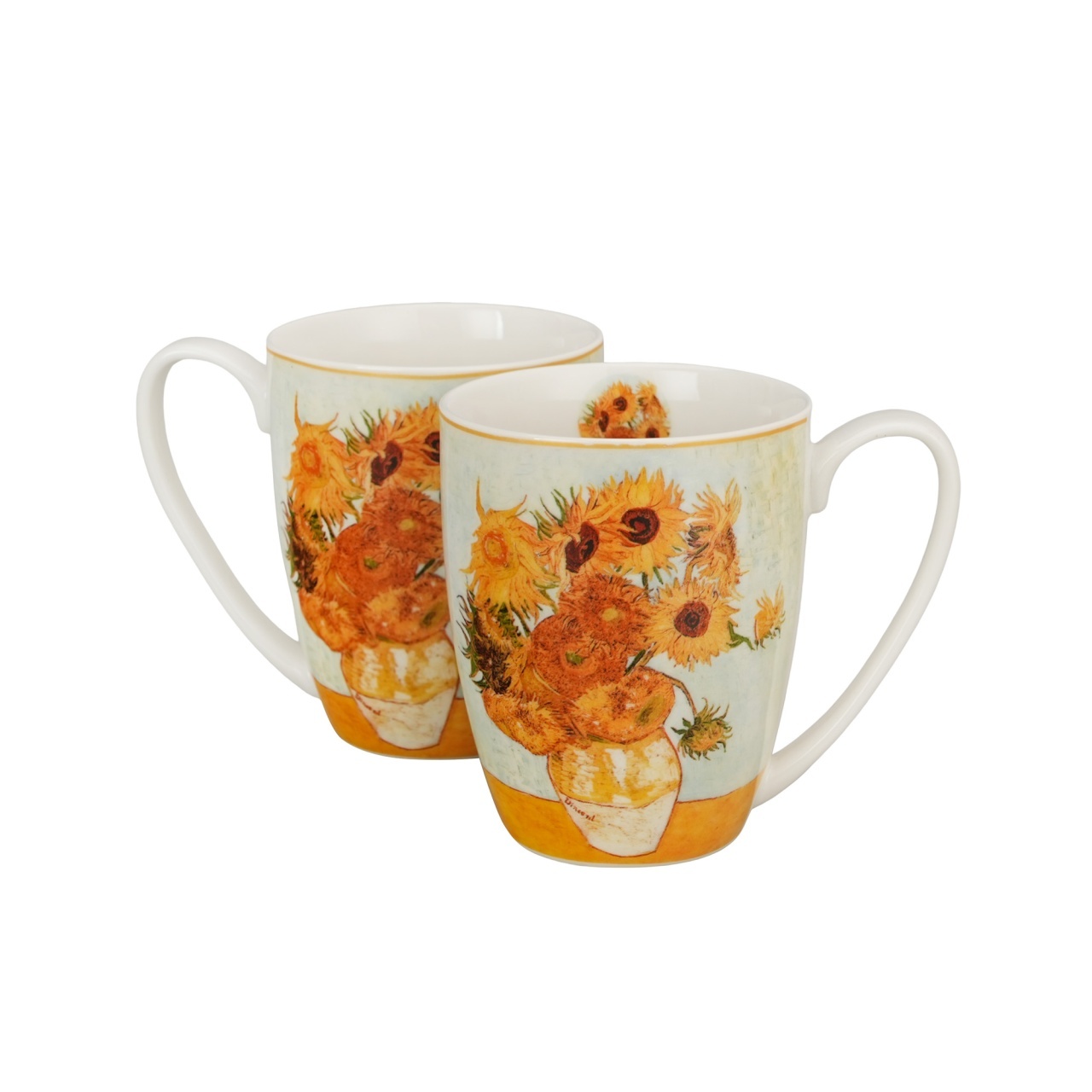 Set 2 Cani 360ml SUNFLOWERS - Adaugati un strop de eleganta si arta in fiecare dimineata cu acest set de cani de 360ml inspirat din capodoperele artistice. Aceste cani sunt perfecte pentru iubitorii de arta si cei care apreciaza un design deosebit. Design artistic: Fiecare cana prezinta un model vibrant cu flori de soare, creand o atmosfera calda si primitoare. Capacitate generoasa: Cu o capacitate de 360ml, canile sunt ideale pentru cafea, ceai sau alte bauturi preferate. Material de calitate: Realizate din ceramica de inalta calitate, aceste cani sunt durabile si rezistente la uzura. Usor de curatat: Pot fi spalate in masina de spalat vase, facilitand intretinerea. Cadou ideal: Ambalate elegant, reprezinta un cadou perfect pentru orice ocazie, de la aniversari la sarbatori. Transformati fiecare ceasca de bautura intr-o experienta de neuitat cu setul de cani SUNFLOWERS . Fie ca le utilizati acasa sau la birou, aceste cani sunt garantate sa incante privirile si sa aduca un zambet pe fata fiecaruia. Comandati acum si bucurati-va de momente de relaxare cu stil!