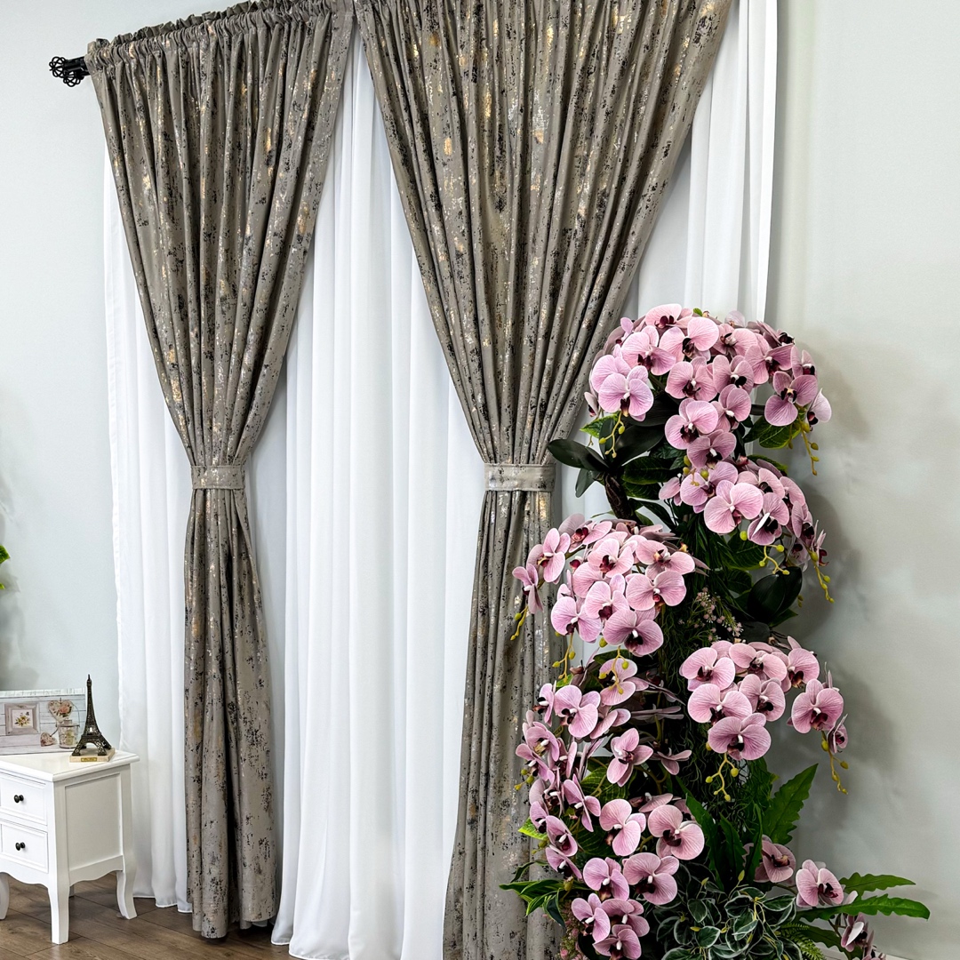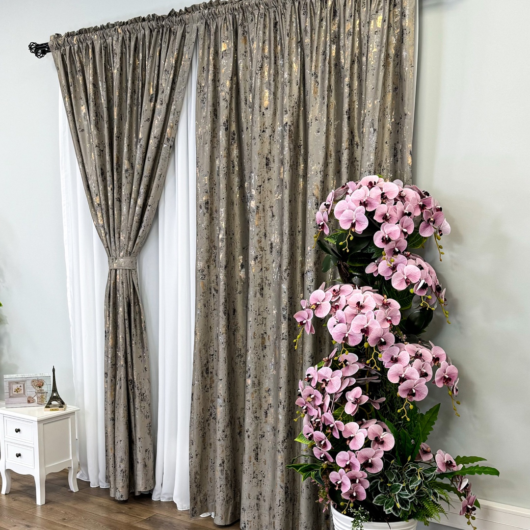 Draperiile din catifea cu insertii aurii reprezinta o alegere sofisticata si luxoasa pentru orice incapere. Aceste draperii sunt confectionate dintr-un material de inalta calitate, catifea, care ofera o textura moale si bogata, aducand un sentiment de rafinament si eleganta in orice spatiu. Ceea ce face draperiile cu insertii aurii cu adevarat remarcabile sunt detaliile aurii. Aceste insertii aurii adauga un element de stralucire si glamour, creand un contrast elegant cu textura mata a