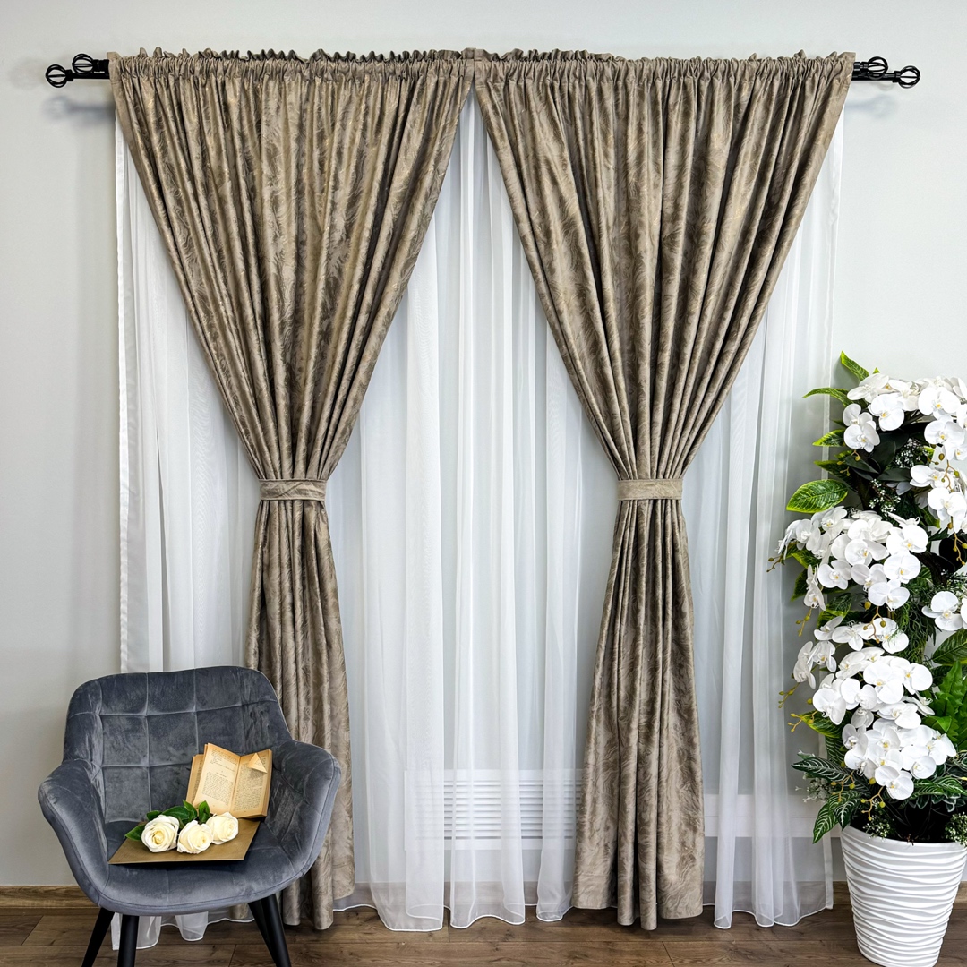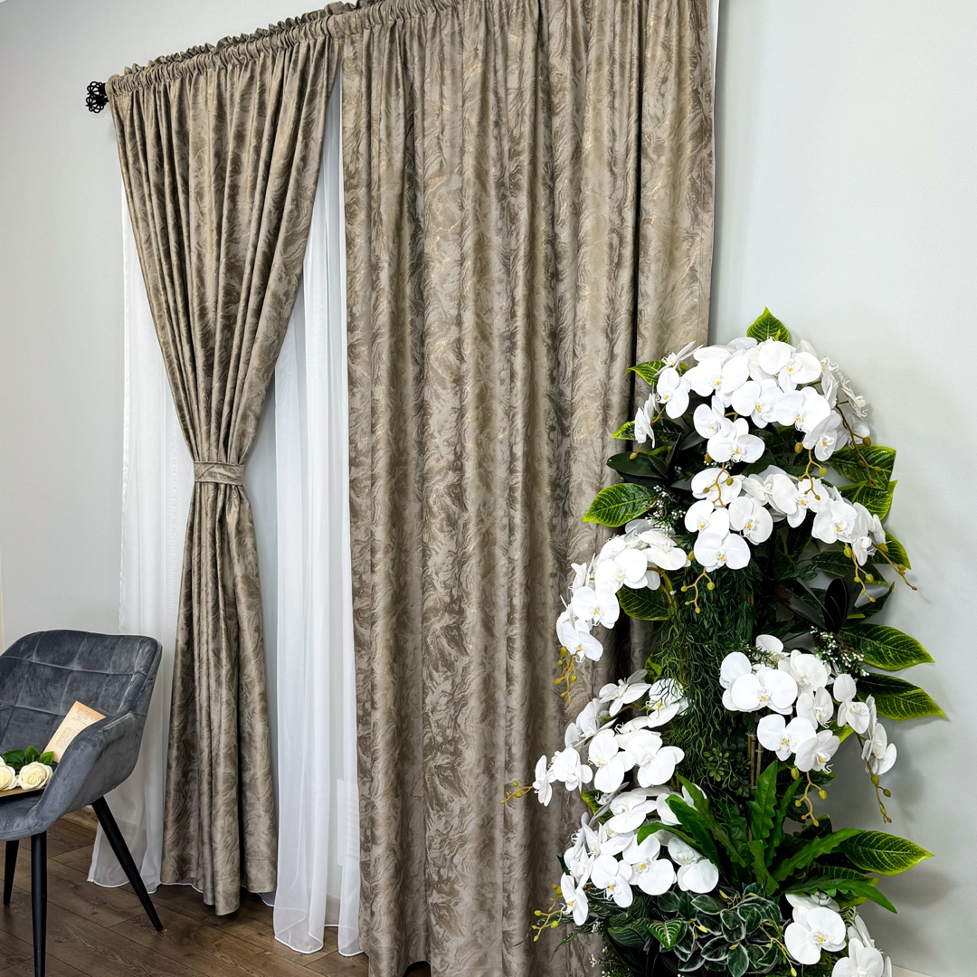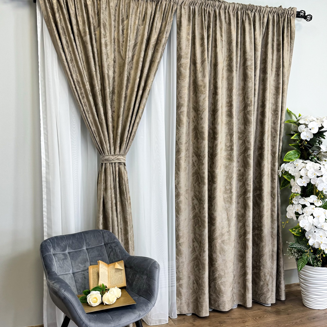 Set 2 Draperii Catifea MYKONOS cu valuri rafinate aurii, Cappuccino - New V6, 140cm latime x 260cm inaltime, cu tiv lat pt bara