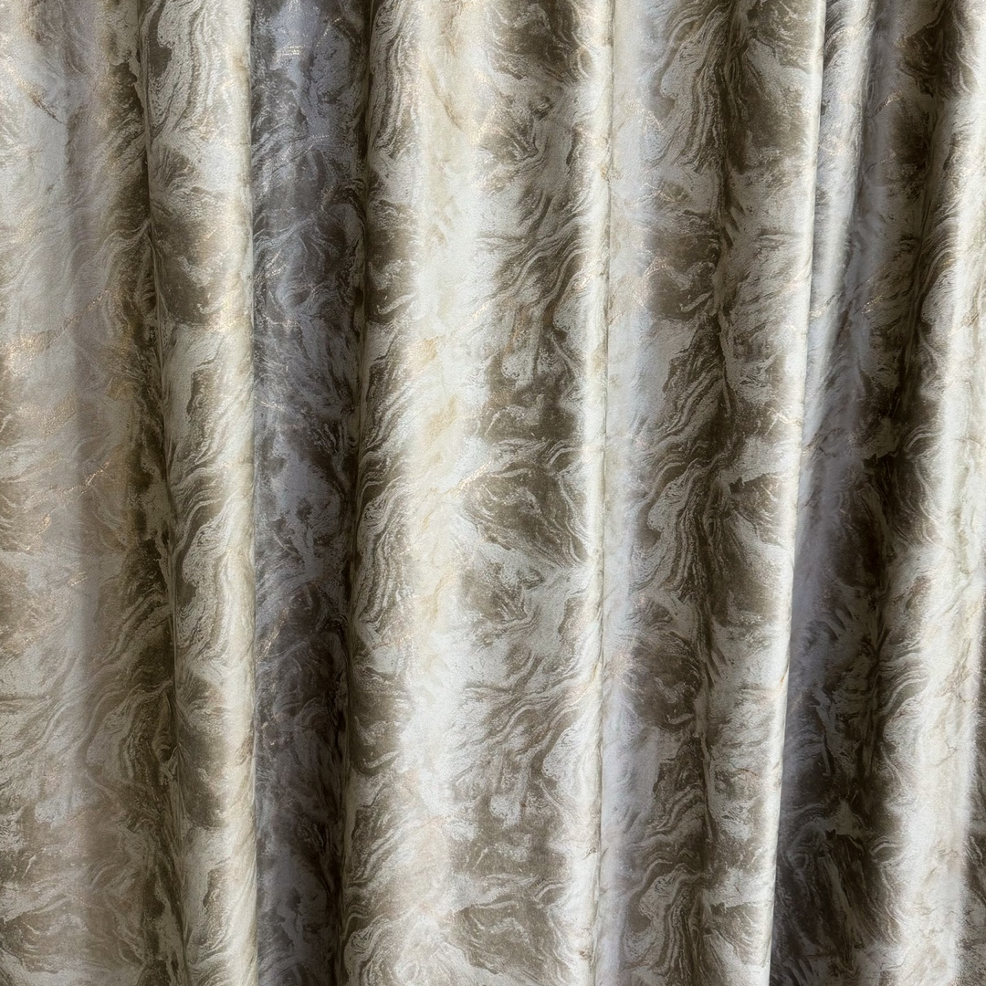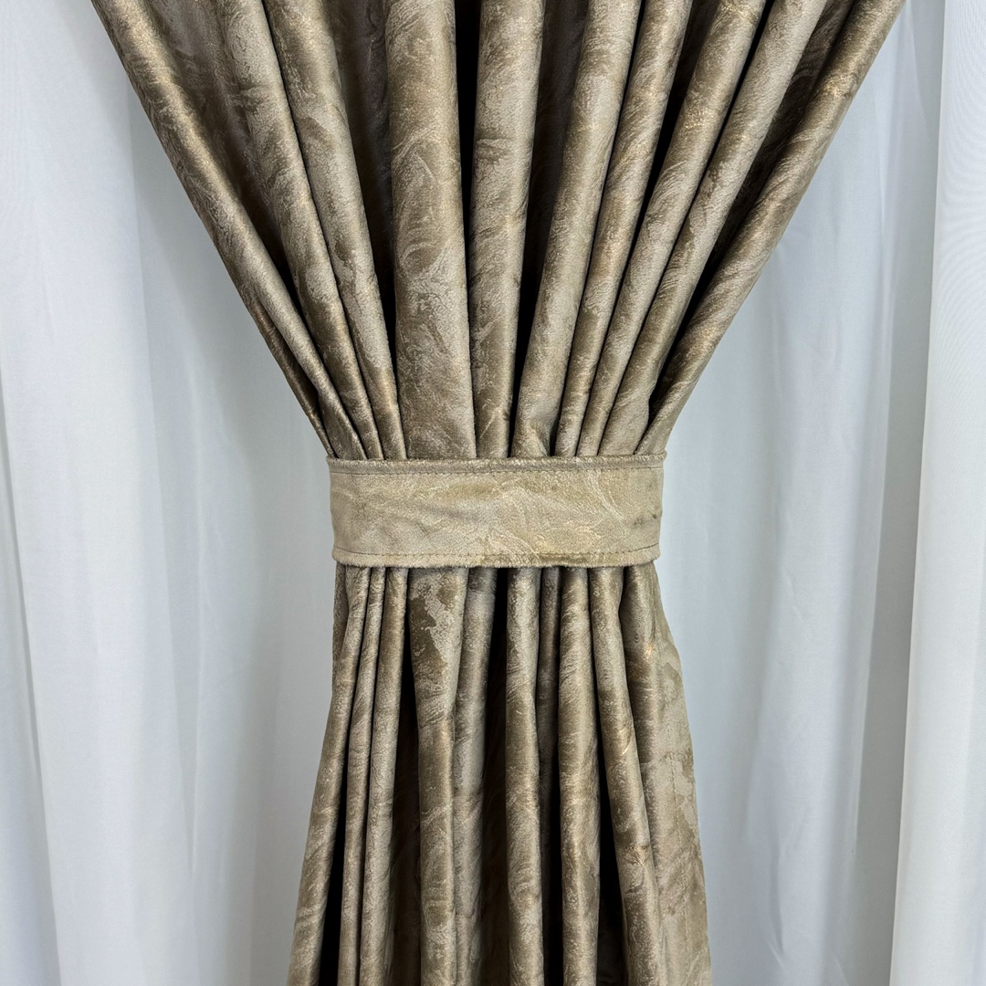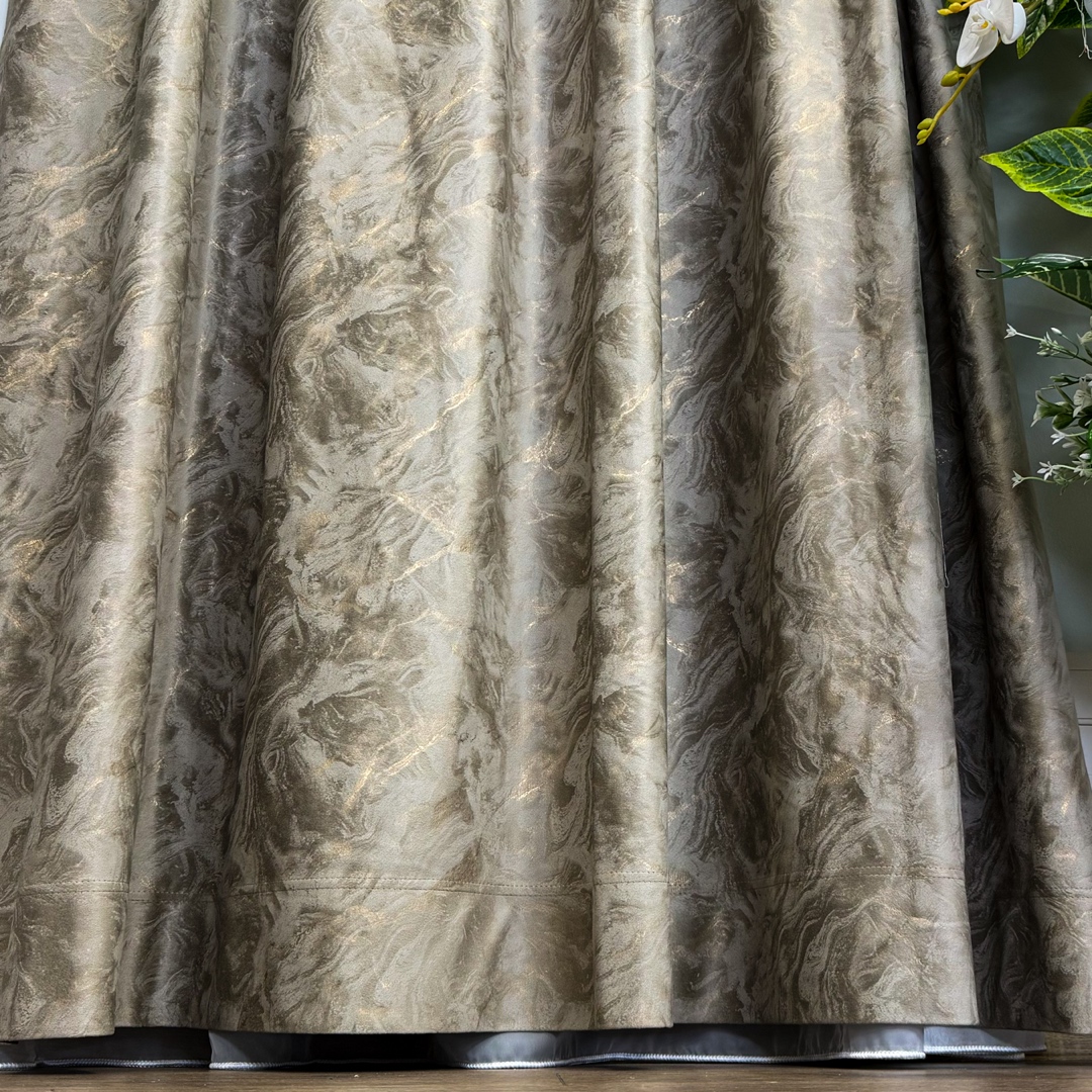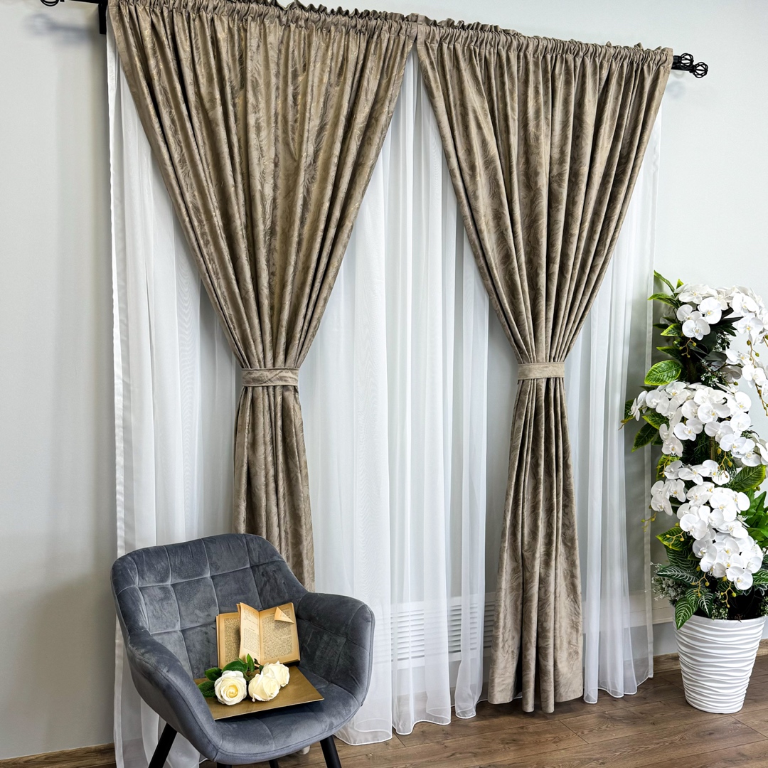 Set 2 Draperii Catifea MYKONOS cu valuri rafinate aurii, Cappuccino - New V6, 140cm latime x 260cm inaltime, cu tiv lat pt bara