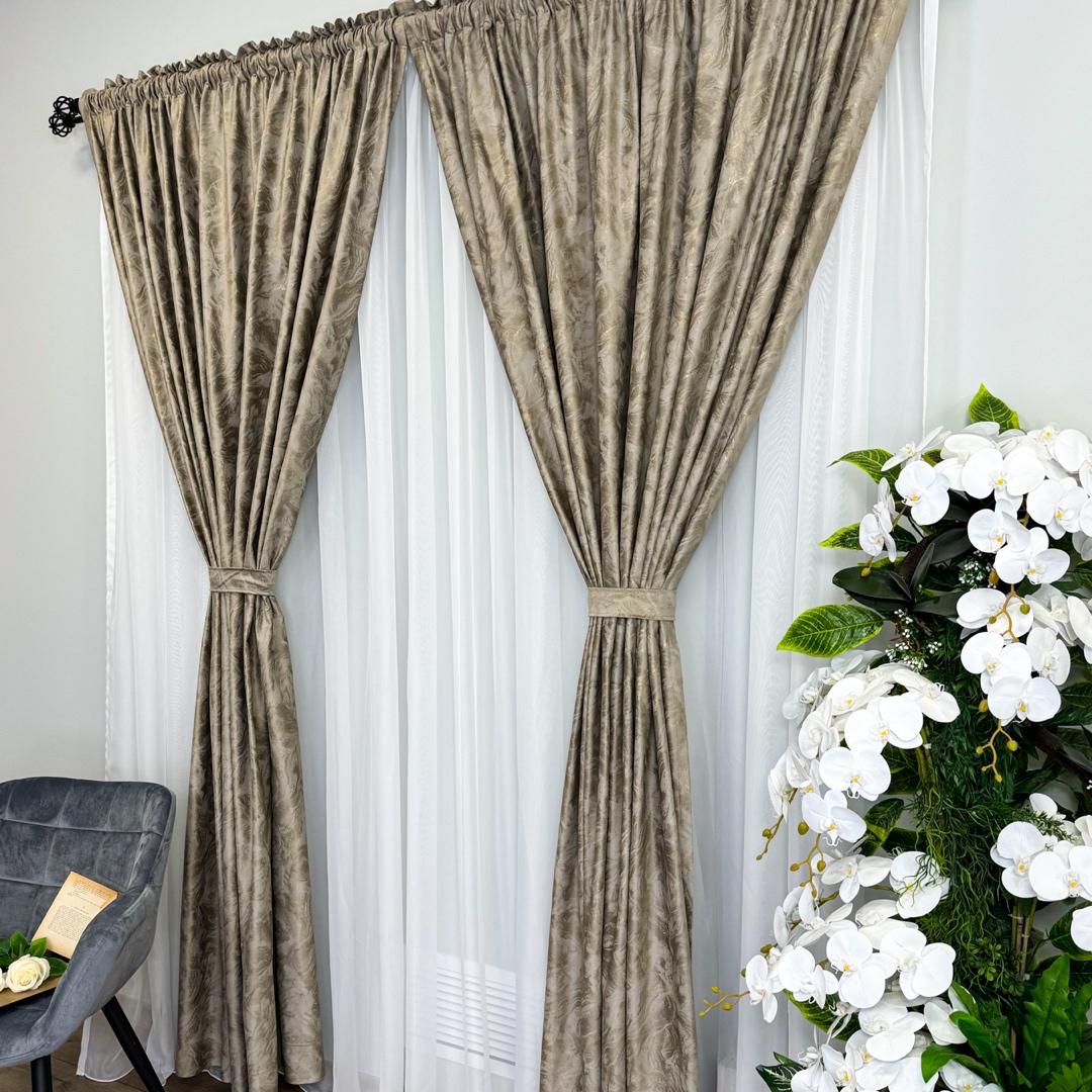 Draperiile din catifea cu insertii aurii reprezinta o alegere sofisticata si luxoasa pentru orice incapere. Aceste draperii sunt confectionate dintr-un material de inalta calitate, catifea, care ofera o textura moale si bogata, aducand un sentiment de rafinament si eleganta in orice spatiu. Ceea ce face draperiile cu insertii aurii cu adevarat remarcabile sunt detaliile aurii. Aceste insertii aurii adauga un element de stralucire si glamour, creand un contrast elegant cu textura mata a