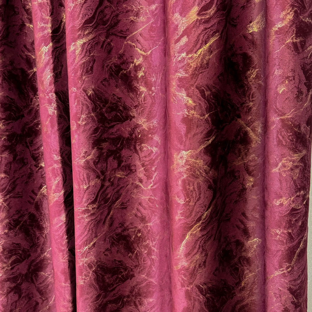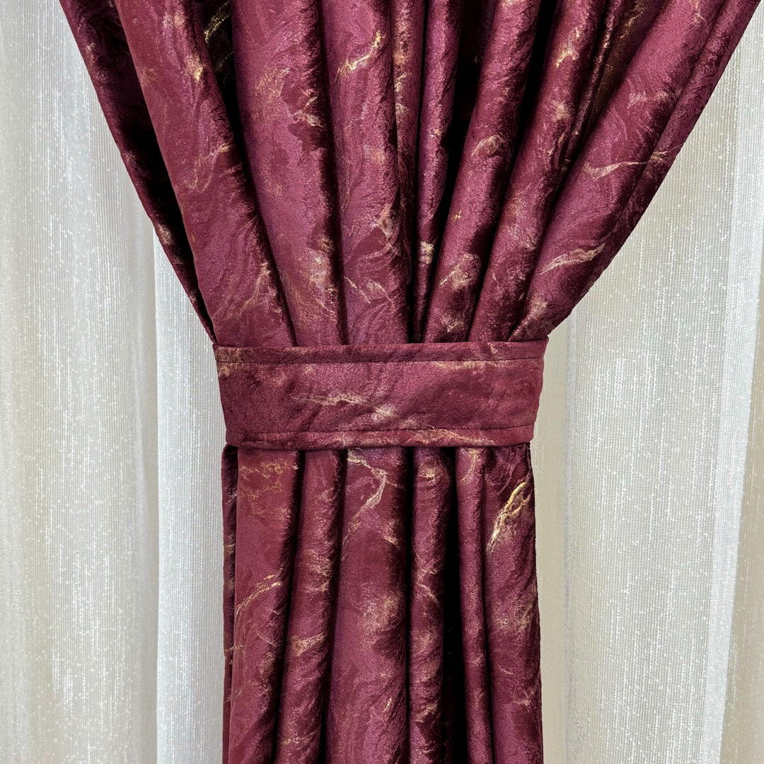 Set 2 Draperii Catifea MYKONOS cu valuri rafinate aurii, Grena - V10, 140cm latime x 260cm inaltime, cu tiv lat pt bara