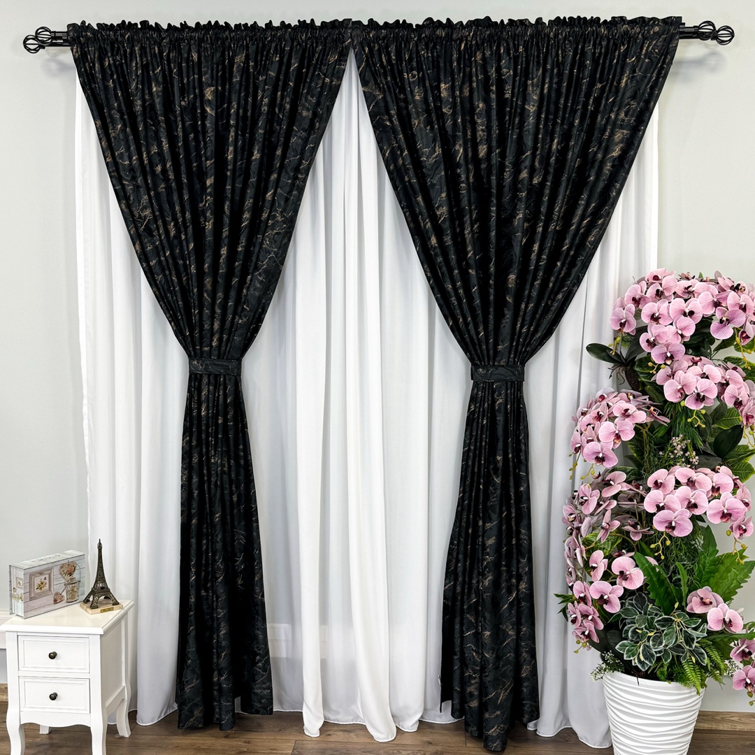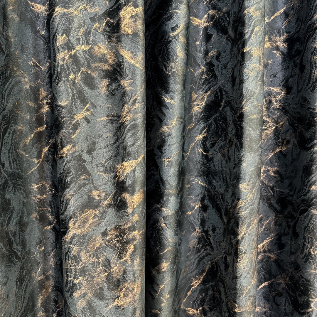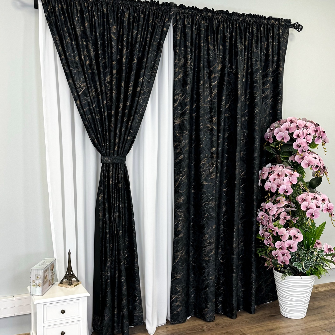Set 2 Draperii Catifea MYKONOS cu valuri rafinate aurii, Negru - V8, 140cm latime x 260cm inaltime, cu tiv lat pt bara