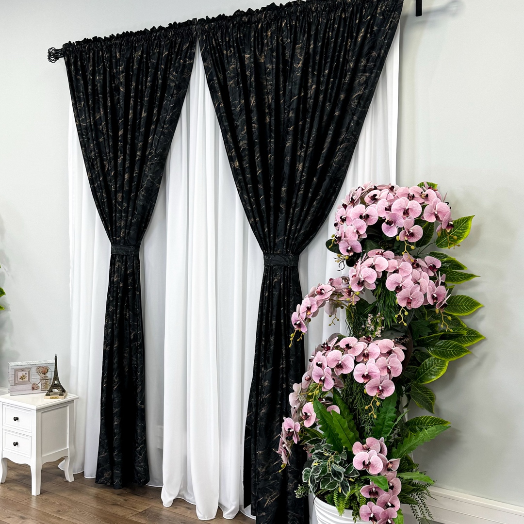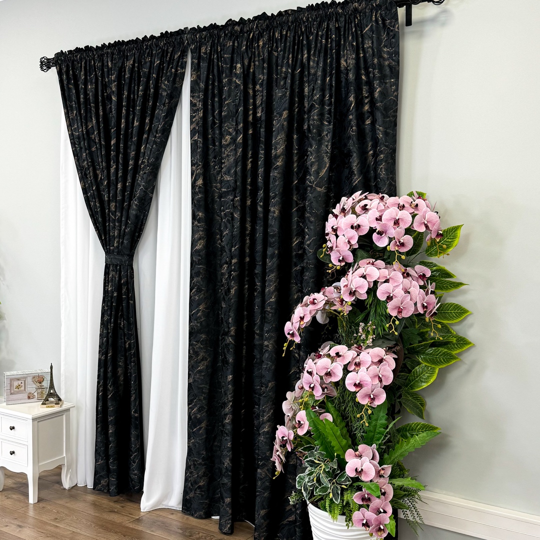 Draperiile din catifea cu insertii aurii reprezinta o alegere sofisticata si luxoasa pentru orice incapere. Aceste draperii sunt confectionate dintr-un material de inalta calitate, catifea, care ofera o textura moale si bogata, aducand un sentiment de rafinament si eleganta in orice spatiu. Ceea ce face draperiile cu insertii aurii cu adevarat remarcabile sunt detaliile aurii. Aceste insertii aurii adauga un element de stralucire si glamour, creand un contrast elegant cu textura mata a