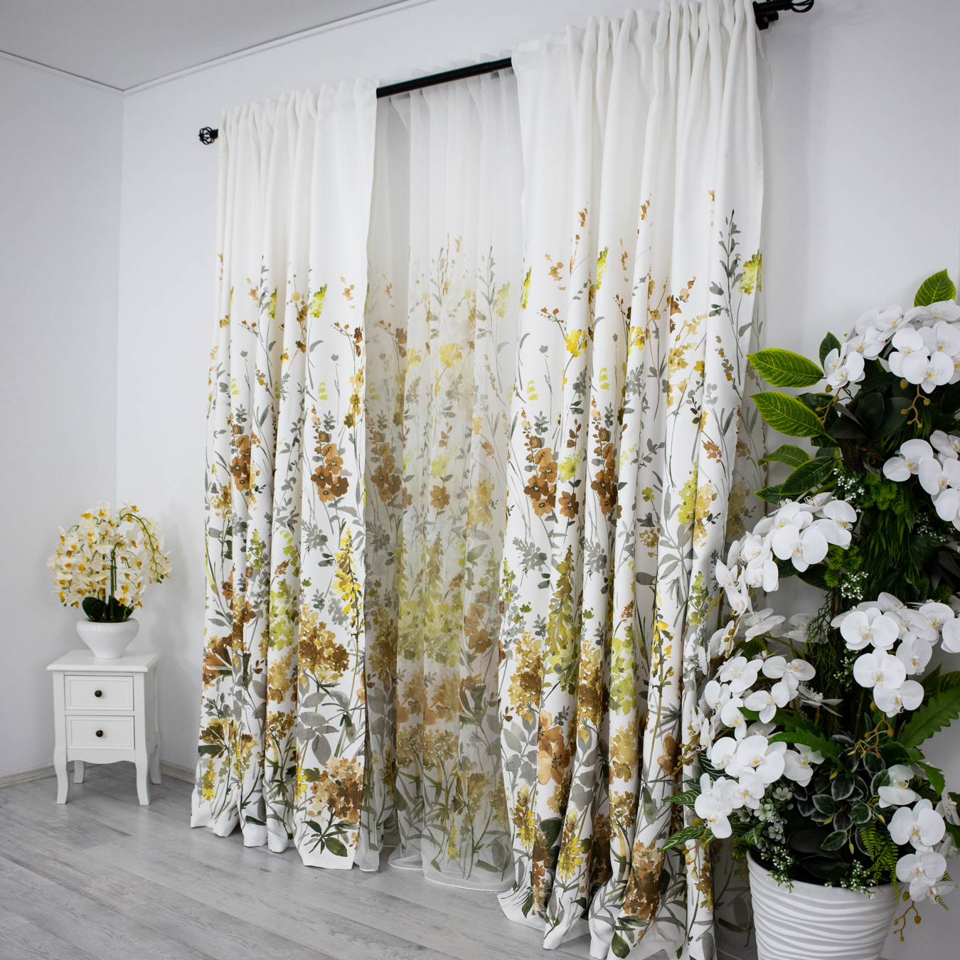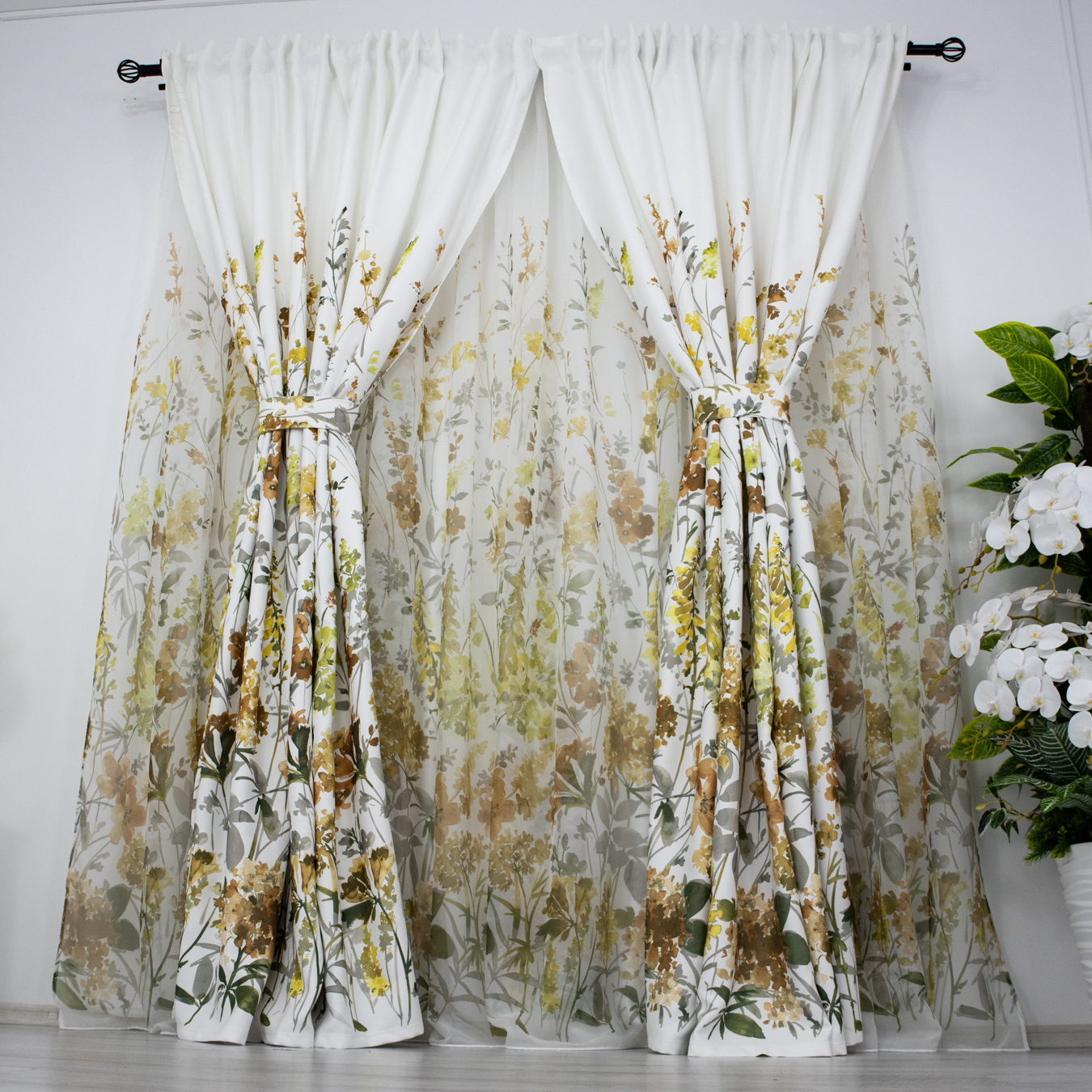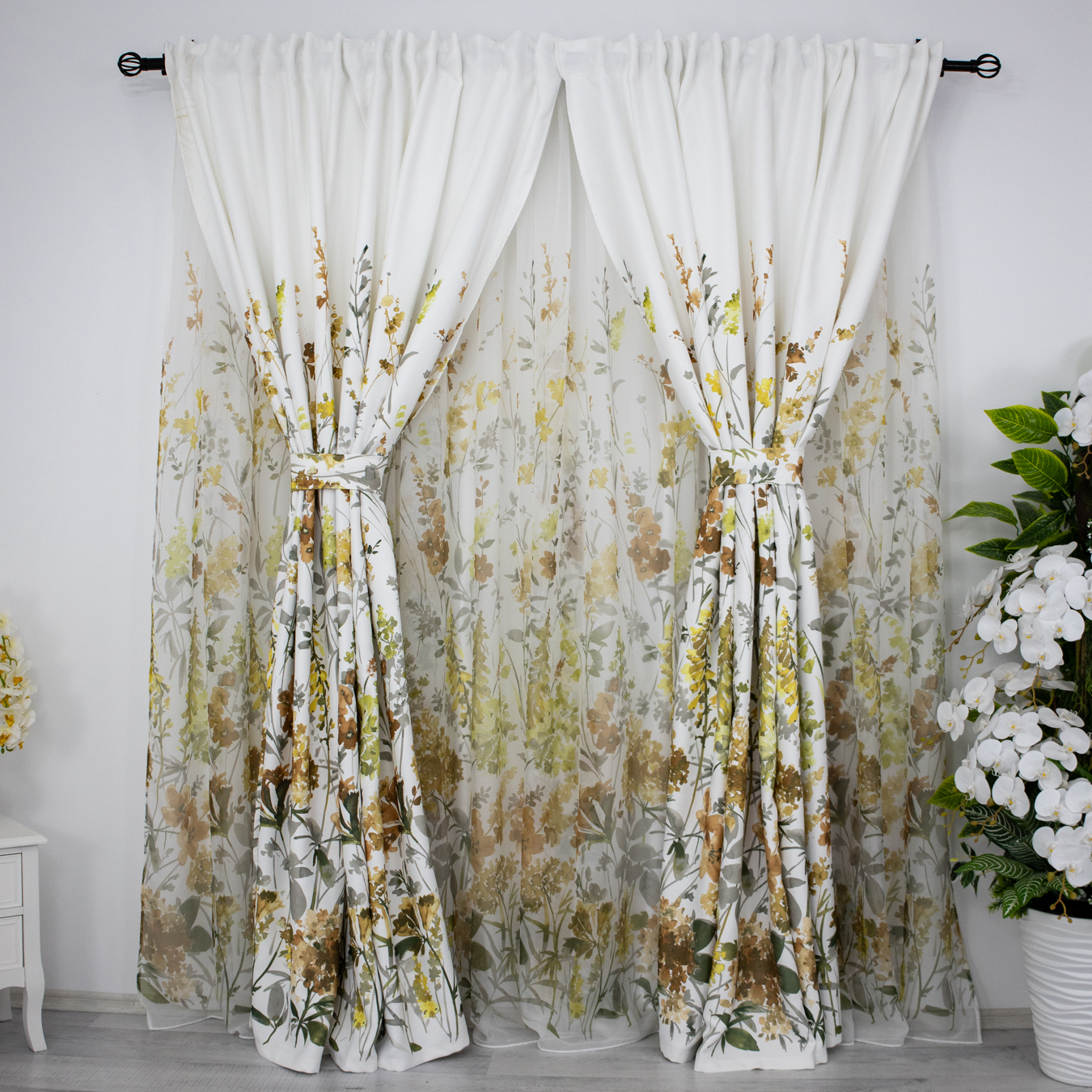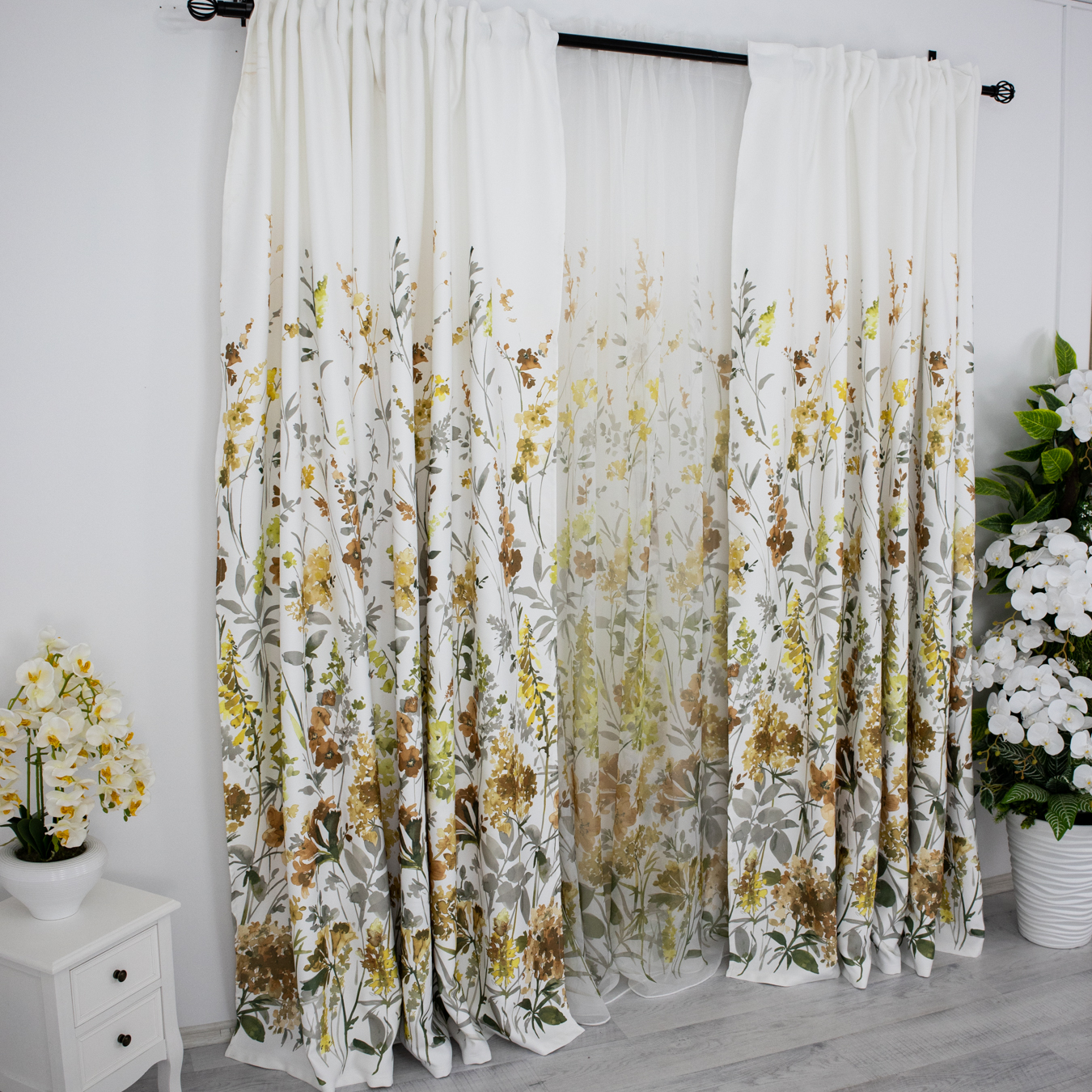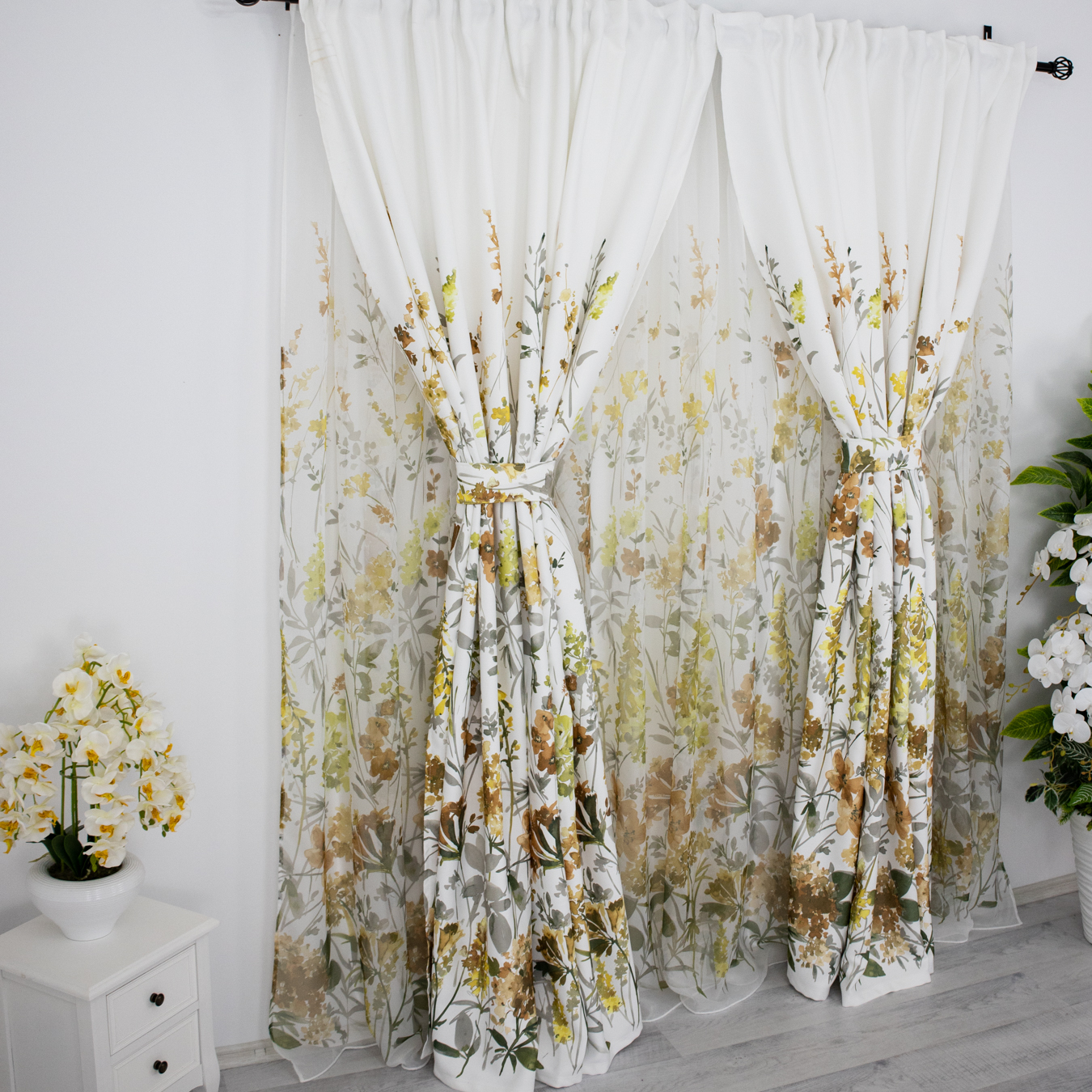 Set 2 Draperii Satinate Imprimate, flori maro, 140cm latime x 260cm inaltime, cu tiv lat pt bara