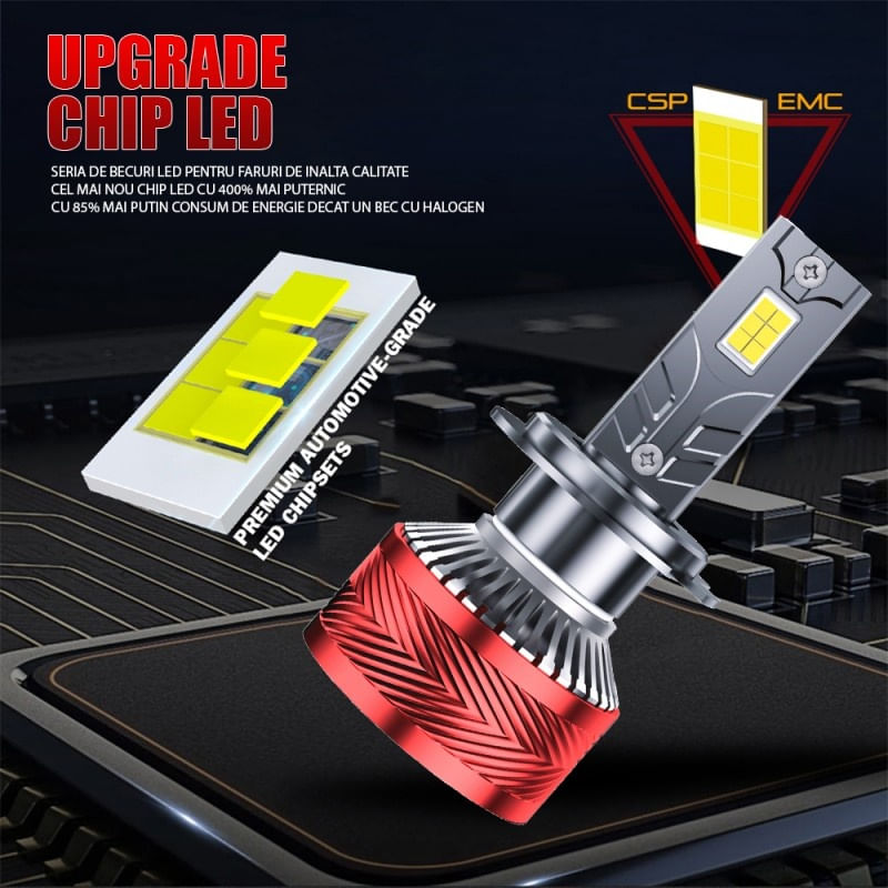 Iti propunem unul dintre cele mai moderne seturi de becuri led auto pe care le poti monta pe autoturismul tau. Beneficiezi de tehnologie CREE pentru sursa de lumina. Aceste becuri led sunt compatibile cu H1, H3, H7, H11, 9005, 9006, 9012, H4, H13, 9004. Mai mult decat atat, dispun si de Canbus, astfel incat nu iti vei bate capul cu erori false de bec ars afisate in bord.Inaltimea becurilor este de 7,6 cm iar diametrul ventilatorului 3.5 cm. Becurile cu LED de generatie noua pentru farurile auto cu montare fara modificari se potrivesc perfect in orice far.Racirea ledurilor este asigurata de un ventilator ultra-silentios de mare putere (12.000 rotatii pe minut).Aprinderea acestor becuri led 9007 este foarte rapida, doar 0.15 secunde , ceea ce le face ideale pentru faza scurta sau unde este necesara aprinderea aproape instant a luminilor.Specificatii: Tensiune alimentare: 12V / 24V Led COB de calitate BridgeLux Chip Putere Led: 120W / 18000 Lumeni Temperatura Culoare: 6000 K (Alb Xenon) Potrivit Pentru Soclu Auto 9007 Temperatura functionare: -35 +105 grade Cip LED: cipuri CSP 3570 Unghiul fasciculului 360 de grade Grad de impermeabilitate: IP68 Material: Aliaj din dur aluminiu de aviatie 6063 Durata de viata : >50.000 ore Dimensiuni reduse pentru a se potrivi cu 99% din faruri Driver inteligent care mareste sau scade turatia ventilatorului in functie de nevoi si care are protectie la supraincalzire Pornire instant in 0.15 secunde (fara timp de incarcare vs HID).Pachet include: 1 x cutie carton 2 x becuri LED auto pentru faruri 1 x manual de instructiuni.Tip soclu: 9007 faza scurta - faza lunga Compatibil cu H1, H3, H7, H11, 9005, 9006, 9012, H4, H13, 9004.