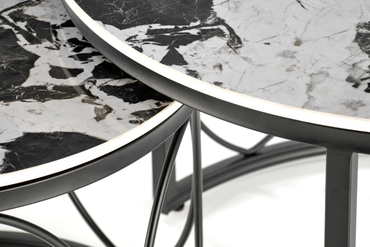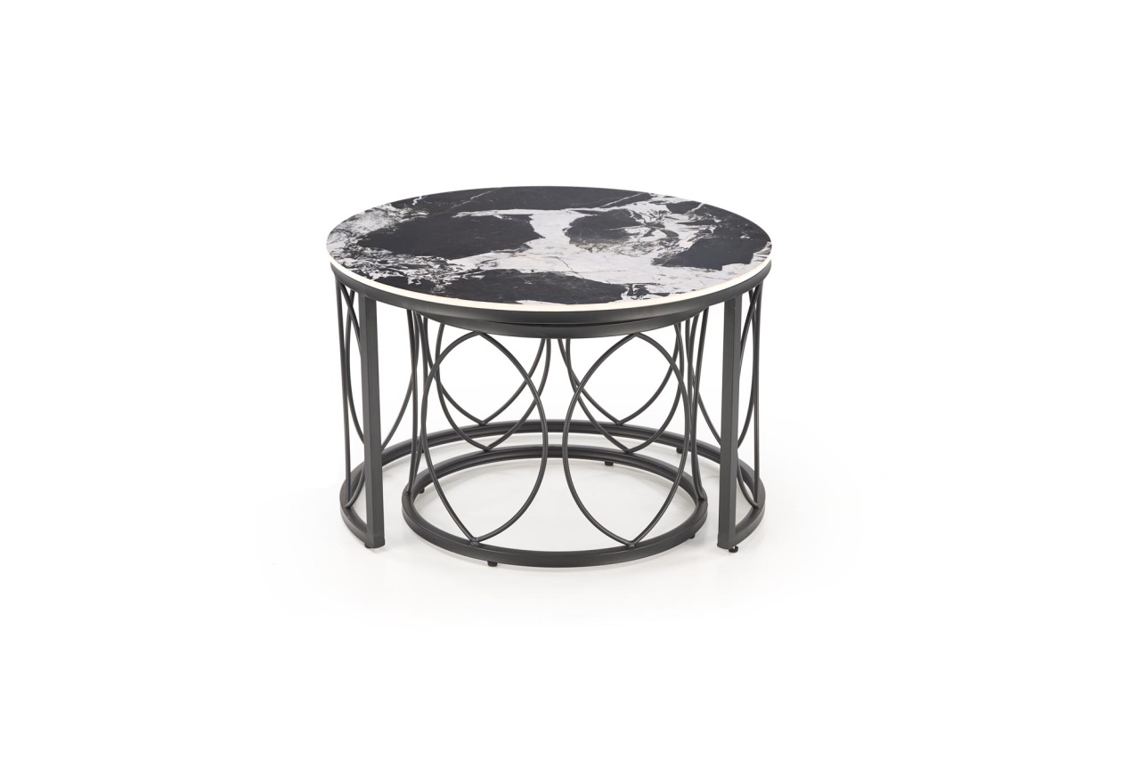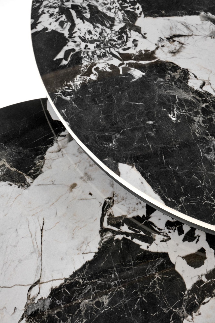 Setul de 2 mese de cafea Alexandra în nuanțe de marmură neagră și negru adaugă un plus de eleganță și versatilitate oricărui living modern. Cu un design minimalist și rafinat, acest set este perfect pentru cei care doresc să combine funcționalitatea cu stilul. Aceste două mese de cafea, de dimensiuni diferite, oferă flexibilitate în decorarea spațiului de zi. Mesele pot fi folosite împreună sau separat, în funcție de nevoile tale, aducând un plus de funcționalitate. Blaturile din finisaj cu efect de marmură neagră contrastează frumos cu picioarele negre din metal, creând o estetică modernă și atemporală. Dimensiuni: Masa 1 Diametru: 70 cm Înălțime: 46 cm Masa 2 Diametru: 50 cm Înălțime: 41 cm Detalii tehnice: Oțel sinterizat / oțel vopsit cu pulbere Culoare: Marmură neagră / Negru Produsul nu este montat. Asamblarea este rapidă și ușoară.