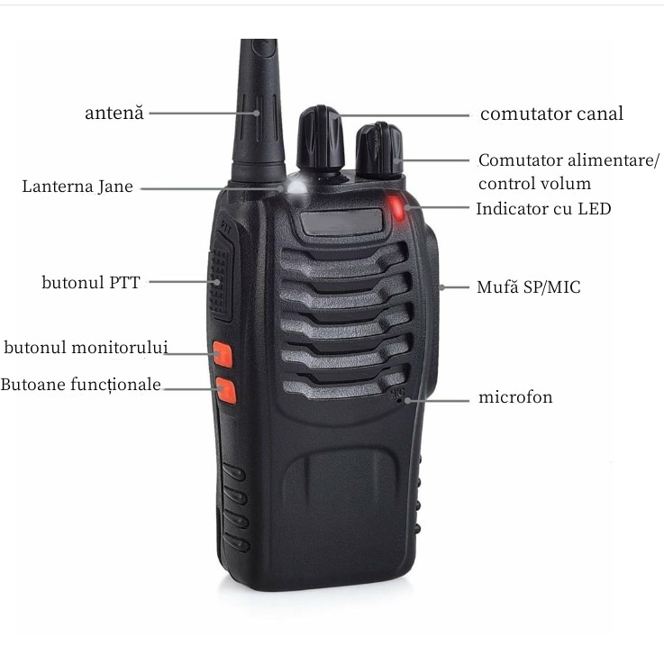 Set 2 statii radio portabile, Walkie Talkie, 16 canale, Negru Produsul este perfect pentru utilizarea in paza, in cadrul unei zone de constructie, intr-un supermarket, hotel, restaurant, service auto, depozite. Poate fi folosit si pentru drumetii, la munte, ciclism, vanatoare, partii de ski, planorism, paintball, airsoft, in orice loc unde nu ai semnal la telefon si in multe alte activitati. Este dotata cu lanterna led cu dubla functie (normala si strobe). Daca activati functia VOX (Voice Operated Transmission) puteti transmite mesaje fara a mai apasa butoanele de transmisie, statia se va activa la vocea dvs. Specificatii produs: Distanta lucru: 1-2 km in oras si pana la 5 km in camp deschis Acumulator 1500 mAh Li-ion Codificari / Tonuri 50 CTCSS/105 CDCSS Instructiuni vocale (Voice Prompt) Programabila prin computer Alarma de urgenta Incarcare inteligenta Sistem de economisire acumulator Alerta pentru baterie descarcata Time-out Timer Lanterna LED Putere emisie RF: 5W Spatiu canale: 25KHz Voltaj acumulator: 3.7 V Autonomie acumulator: 8-24 h Temperatura functionare: -30°c +60°c Impedanta antena: 50 Ohm Dimensiuni (L×l×H) 115×60×33 mm Aceste dimneisuni sunt cu baterie, fara antena.