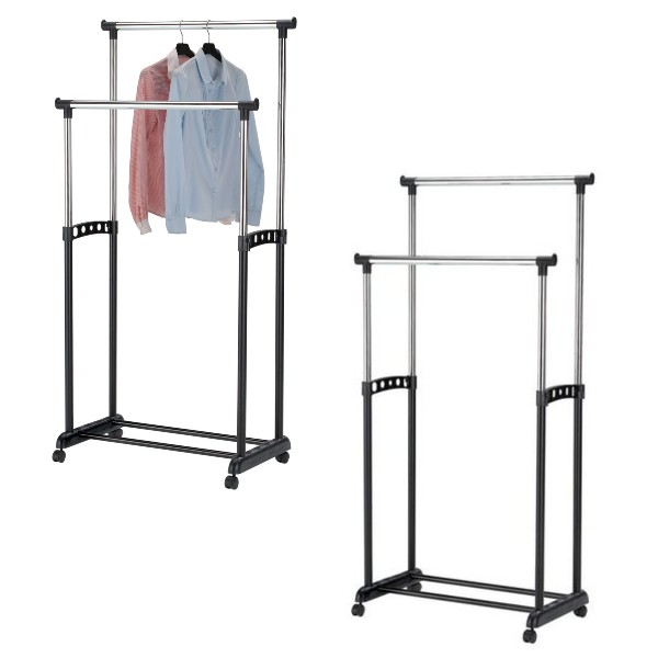 Suport metalic mobil dublu pentru imbracaminte - inaltime 140 cm suport haine pentru umerase reglabil pe inaltime extrem de util pentru aranjarea hainelor cadrul acestui suport este din metal greutate suport : 3.45 kg greutatea maxima admisa: 20 kg dimensiuni: 83 x 43 x 94-140 cm