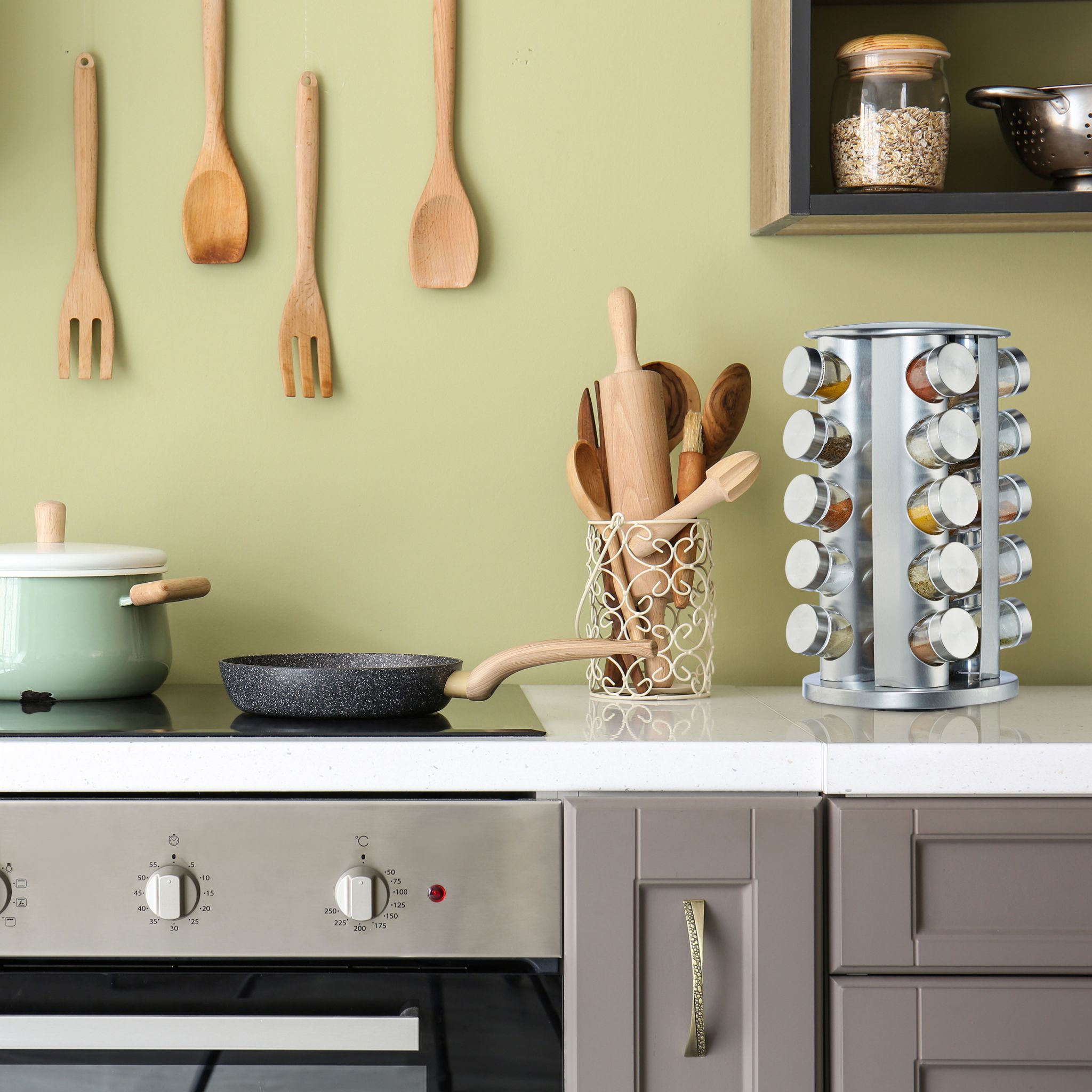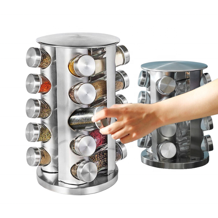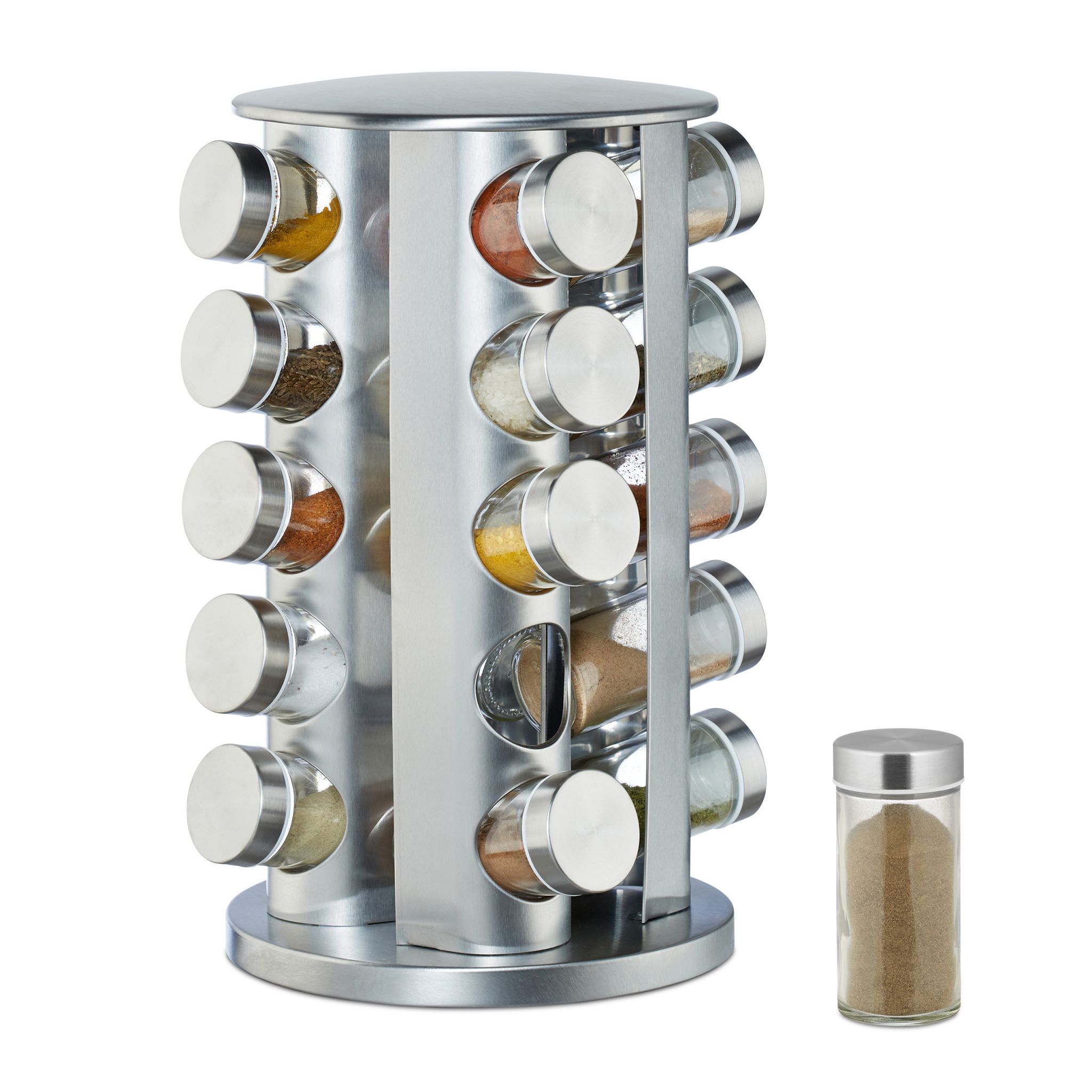 Set 20 recipiente pentru condimente cu suport rotativ Fabricat din otel inoxidabil, sticla si plastic Lungime 19 cm Latime 19 cm Inaltime 34 cm Greutate 1.5 kg Suportul de condimente este echipat cu 20 de borcane din sticla pentru condimente pe 5 niveluri si poate fi rotit complet. Recipientele pot fi utilizate la depozitarea condimentelor si la dozarea acestora datorita capacelor lor perforate. Cu aspectul sau colorat din cupru, suportul pentru condimente din otel inoxidabil se evidentiaza in fiecare bucatarie. Datorita placii turnante, suportul pentru condimente poate fi rotit complet - toate conservele la indemana. Aspectul de cupru al otelului inoxidabil face ca suportul rotativ sa iasa in evidenta in bucataria ta. Recipientele cu condimente sunt prevazute cu gauri de dozare cu un diametru de aproximativ 4 mm. Aroma este pastrata datorita capacelor cu insurubare. Pachetul contine: 1 x suport rotativ pentru condimente 20 x recipient de condimente