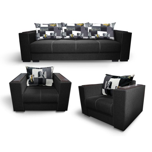 Setul 3+1+1 Solis este alcatuit dintr-o canapea cu 3 locuri si 2 fotolii fixe. Canapeaua Solis este o canapea moderna conceputa pentru un stil de viata activ fiind foarte usor de extins si de strans. Canapeaua Solis este extensibila putand fi utilizata zilnic atat ca si canapea pentru petrecerea timpului liber cat si ca un pat generos pe timpul noptii. Suprafata de dormit este 140 * 190 cm. Canapeaua Solis are saltele cu plasa de arcuri (tip Relaxa) si burete de densitate mare pentru o rezistenta sporita in timp, iar datorita suprafetei plane care se formeaza atunci cand se extinde asigura un somn odihnitor pe timpul noptii. Atat canapeaua cat si pernele sunt tapitate cu stofa. Canapeaua Solis are o lada de depozitare generoasa foarte practica atat pentru lenjeria de pat, cat si pentru diverse obiecte pe care le folositi rar. Sezutul in varianta stransa are o latime generoasa de 70 cm si poate fi folosit de o persoana in timpul zilei pentru un pui de somn fara a mai fi nevoie sa extindeti canapeaua. Canapeaua Solis are 3 perne pufoase foarte utile pentru o sedere cat mai confortabila pe canapea, dar si pentru o pata de culoare. Canapeaua Solis este foarte usor de montat avand elemente de cuplare rapide. Canapeaua Solis este prevazuta cu un peretar prins intre brate care ramane la perete atunci cand canapeaua este extinsa si este folosita pentru dormit. Peretarul protejeaza peretele si asigura un confort sporit pentru persoana care va dormi la perete. Cusaturile de pe sezutul canapelei dau o eleganta aparte canapelei Solis. Pe bratele canapelei se afla ornamente din MDF wenge care pot fi folosite ca suport pentru pahare. Dimensiuni canapea Solis stransa: Lungime: 2320 mm Adancime: 990 mm Inaltime: 710 mm Suprafata de dormitor canapea Solis: 1400 x 1900 mm Fotoliul Solis este un fotoliu modern conceput pentru un stil de viata activ. Fotoliul Solis are saltea cu plasa de arcuri (tip Relaxa) si burete de densitate mare pentru o rezistenta sporita in timp. Atat fotoliul cat si perna sunt tapitate cu stofa. Fotoliul Solis are o perna pufoasa foarte utila pentru o sedere cat mai confortabila pe fotoliu, dar si pentru o pata de culoare. Cusaturile de pe sezutul fotoliului dau o eleganta aparte produsului. Pe bratele fotoliului se afla ornamente din MDF wenge care pot fi folosite ca suport pentru pahare. Fotoliul Solis este foarte usor de montat avand elemente de cuplare rapide. Dimensiuni fotoliu Solis: Lungime: 1080 mm Adancime: 860 mm Inaltime: 730 mm