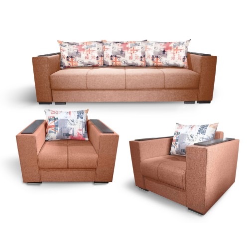 Setul 3+1+1 Solis este alcatuit dintr-o canapea cu 3 locuri si 2 fotolii fixe. Canapeaua Solis este o canapea moderna conceputa pentru un stil de viata activ fiind foarte usor de extins si de strans. Canapeaua Solis este extensibila putand fi utilizata zilnic atat ca si canapea pentru petrecerea timpului liber cat si ca un pat generos pe timpul noptii. Suprafata de dormit este 140 * 190 cm. Canapeaua Solis are saltele cu plasa de arcuri (tip Relaxa) si burete de densitate mare pentru o rezistenta sporita in timp, iar datorita suprafetei plane care se formeaza atunci cand se extinde asigura un somn odihnitor pe timpul noptii. Atat canapeaua cat si pernele sunt tapitate cu stofa. Canapeaua Solis are o lada de depozitare generoasa foarte practica atat pentru lenjeria de pat, cat si pentru diverse obiecte pe care le folositi rar. Sezutul in varianta stransa are o latime generoasa de 70 cm si poate fi folosit de o persoana in timpul zilei pentru un pui de somn fara a mai fi nevoie sa extindeti canapeaua. Canapeaua Solis are 3 perne pufoase foarte utile pentru o sedere cat mai confortabila pe canapea, dar si pentru o pata de culoare. Canapeaua Solis este foarte usor de montat avand elemente de cuplare rapide. Canapeaua Solis este prevazuta cu un peretar prins intre brate care ramane la perete atunci cand canapeaua este extinsa si este folosita pentru dormit. Peretarul protejeaza peretele si asigura un confort sporit pentru persoana care va dormi la perete. Cusaturile de pe sezutul canapelei dau o eleganta aparte canapelei Solis. Pe bratele canapelei se afla ornamente din MDF wenge care pot fi folosite ca suport pentru pahare. Dimensiuni canapea Solis stransa: Lungime: 2320 mm Adancime: 990 mm Inaltime: 710 mm Suprafata de dormitor canapea Solis: 1400 x 1900 mm Fotoliul Solis este un fotoliu modern conceput pentru un stil de viata activ. Fotoliul Solis are saltea cu plasa de arcuri (tip Relaxa) si burete de densitate mare pentru o rezistenta sporita in timp. Atat fotoliul cat si perna sunt tapitate cu stofa. Fotoliul Solis are o perna pufoasa foarte utila pentru o sedere cat mai confortabila pe fotoliu, dar si pentru o pata de culoare. Cusaturile de pe sezutul fotoliului dau o eleganta aparte produsului. Pe bratele fotoliului se afla ornamente din MDF wenge care pot fi folosite ca suport pentru pahare. Fotoliul Solis este foarte usor de montat avand elemente de cuplare rapide. Dimensiuni fotoliu Solis: Lungime: 1080 mm Adancime: 860 mm Inaltime: 730 mm
