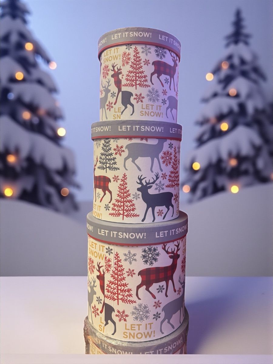 Un set modern de cutii rotunde pentru cadouri, cu imprimeu festiv în nuanțe nordice: reni stilizați, fulgi de nea și mesajul „Let it Snow!”. Designul combină roșu, gri și alb într-o estetică de iarnă scandinavă, ideală pentru cadouri tematice, decor sezonier sau aranjamente speciale. Realizate din carton rigid de calitate superioară, cutiile sunt rezistente, elegante și pot fi reutilizate. Fiecare cutie are capac detașabil și se depozitează perfect una în alta, pentru economie de spațiu. Dimensiuni: • Cutie mare: 21 cm diametru x 18 cm înălțime • Cutie medie: 19 cm diametru x 15 cm înălțime • Cutie mică: 17 cm diametru x 13 cm înălțime Design modern cu tematică de iarnă Ideal pentru cadouri, coșuri tematice, pachete corporate, aranjamente florale Calitate premium – carton gros, print rezistent Set reutilizabil, 3 cutii care intră una în alta