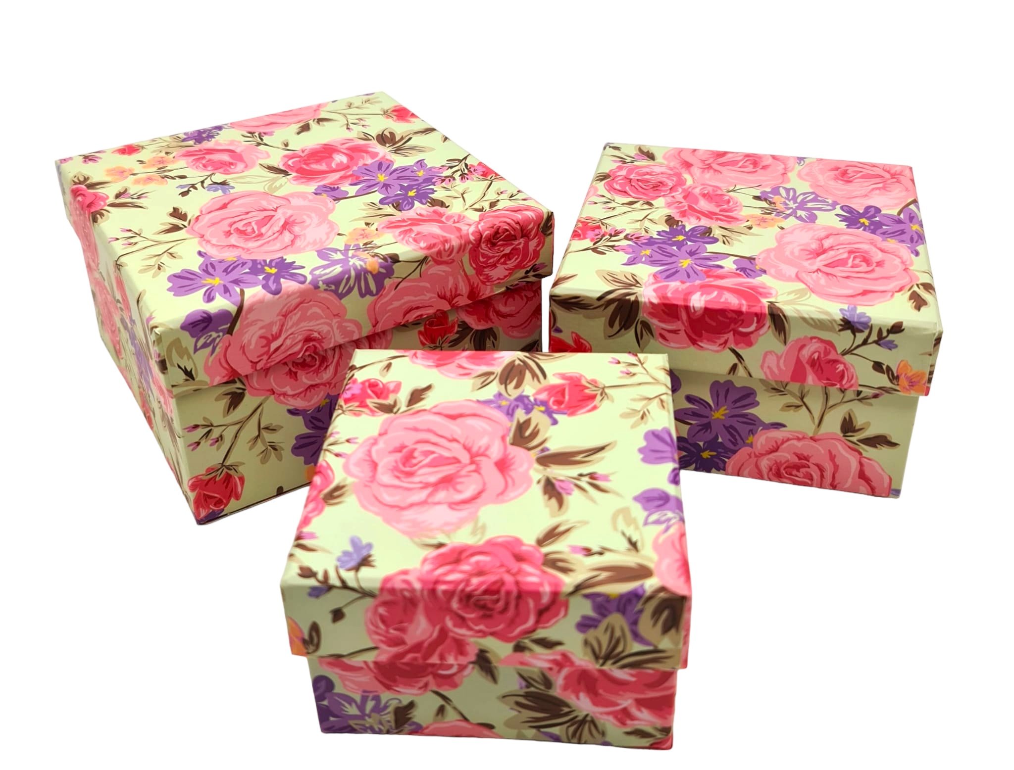 Set 3 cutii engros din carton ROSE model floral 10x12x13cm H7.8, 13.2, 13.2 H6.8, L11.5, l11.5 H5.8, L9.5, l9.5 3buc/setImprimeu floralForma partatamaner ergonomic , cartonateelegante si de inalta calitateCapac Comanda acum aceste cutii din carton. Acestea se vand la set de 3 bucati si sunt elegante si de inalta calitate. De asemenea, au un design deosebit si sunt cartonate.