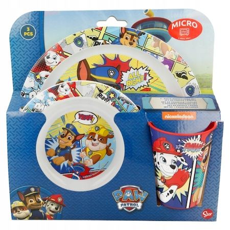 Paw Patrol Un set de 3 vase pentru copii 3 in 1 Produsul vine ambalat intr-o cutie de carton personalizata! Accesoriile practice pentru copii si bebelusi, decorate suplimentar cu personaje preferate din lumea cinematografiei si televiziunii , vor incanta fiecare fan al aventurilor PAW Patrol. Produsul este destinat utilizarii intr-un cuptor cu microunde, este ideal pentru incalzirea zilnica a unei mese. Materialul durabil este rezistent la impact. IDEE PERFECTA PENTRU UN CADOU CREATIV Date tehnice: Un set de feluri de mancare Paw Patrol Setul include: o farfurie, un bol, o cana Material: plastic Fara BPA Licenta oficiala de producator CARACTERISTICI GENERALE Tip produs: Set hranire Culoare: Multicolor Material: Plastic Poveste Personaj: Paw Patrol Caracteristici cheie: Utilizabil in cuptorul cu microunde Continut pachet: 1 Farfurie, 1 Cana, 1 Bol