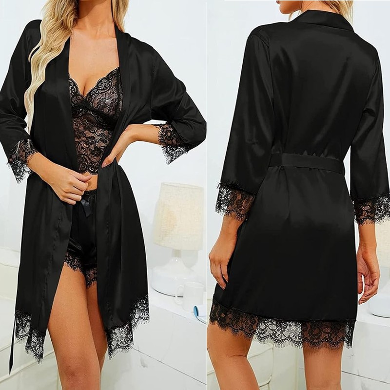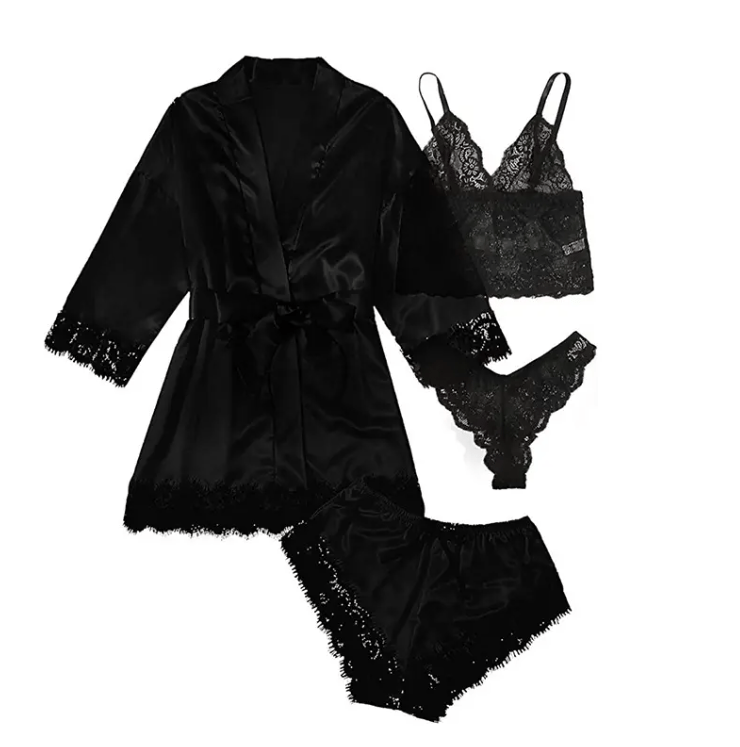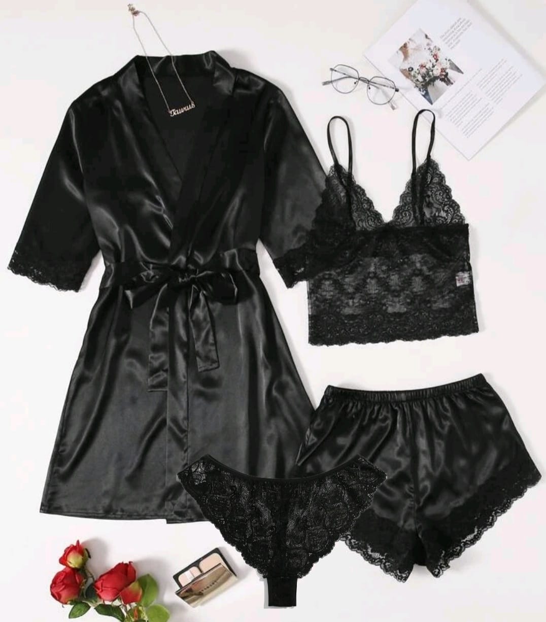 Set 4 piese, Pijama satin Dama, Negru Marime disponibila: S, M, L Set lenjerie erotica, halat, top, pantaloni scurti si chiloti brazilieni. Setul de pijamale cu model animal print sunt fabricate dintr-un material fin si elegant, avand terminatiile brodate cu o dantela eleganta. Pijmalele perfecte pentru un somn linistit. Setul contine: 1x Halat satin 1x Pantaloni scurti satin 1x Bustiera dantela 1x Chilot dantela Set Pijama De Dama 4 Piese Din Satin - Setul de pijamale pentru dame in 4 piese, realizat din satin leopard, este o expresie a rafinamentului si luxului in lumea relaxarii. Cu o varietate de piese atent create, acest set ofera nu doar confortul necesar pentru un somn odihnitor, ci si o doza generoasa de eleganta.