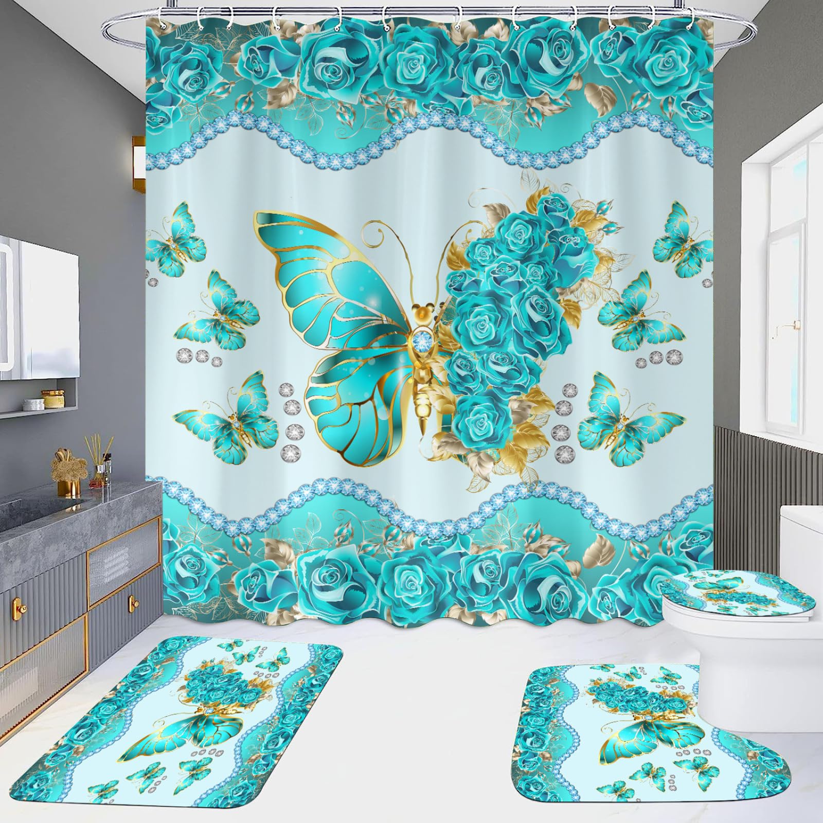 Set baie 4 piese: perdea, covorase si husa de toaleta, Turquoise Butterflies