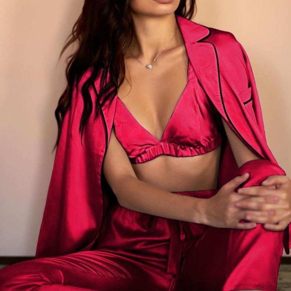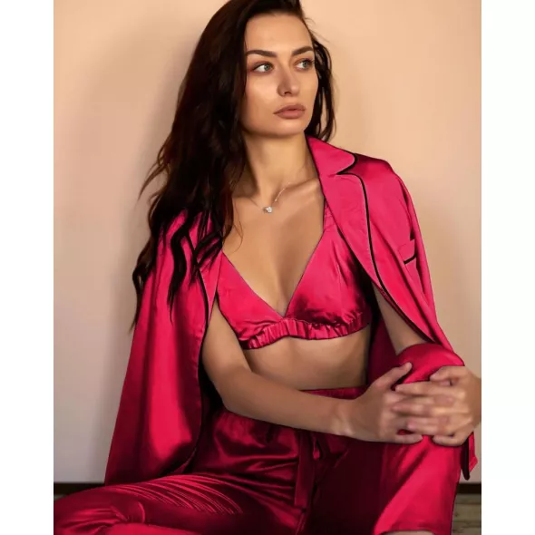 Set dama, Pijama satin 3 piese, Rosu Marime disponibila: S, M, L, XL Transforma noptile obisnuite in momente speciale cu setul nostru de pijamale din satin de 3 piese, disponibil in culorile rafinate de roz, negru si visiniu. Confectionat din satin de inalta calitate, acest set ofera o senzatie placuta si racoroasa pe piele, asigurand un somn linistit si confortabil. Material Premium: Satinul de inalta calitate ofera o textura moale si matasoasa, asigurand confortul pe parcursul noptii. Design Elegant: Setul include o bluza cu maneca lunga si nasturi, pantaloni lungi si un sutien tip bustiera, fiecare piesa avand un design rafinat care combina functionalitatea cu stilul. Marimi Variate: S, M, L, XL Pentru a se potrivi perfect oricarui tip de corp, asigurand un fit ideal. Detalii Bluza: Maneci Lungi: Ofera un plus de caldura si confort in serile mai racoroase. Nasturi in Fata: Permite o imbracare si dezbracare usoara si adauga un element de eleganta. Detalii Pantaloni: Lungime: Pantaloni lungi, croiti pentru a oferi libertate de miscare. Talie Elastica: Asigura un fit perfect si confortabil pe tot parcursul noptii. Detalii Sutien Bustiera: Design fara armaturi, pentru un confort maxim pe timpul noptii. Banda elastica ofera suport suplimentar si se adapteaza formei corpului pentru un fit perfect. Fie ca alegi sa porti acest set pentru o noapte de somn odihnitor sau pentru o seara relaxanta acasa, vei arata si te vei simti fabulos. Imbina confortul cu stilul si adauga acest set de pijamale din satin la garderoba ta de noapte.