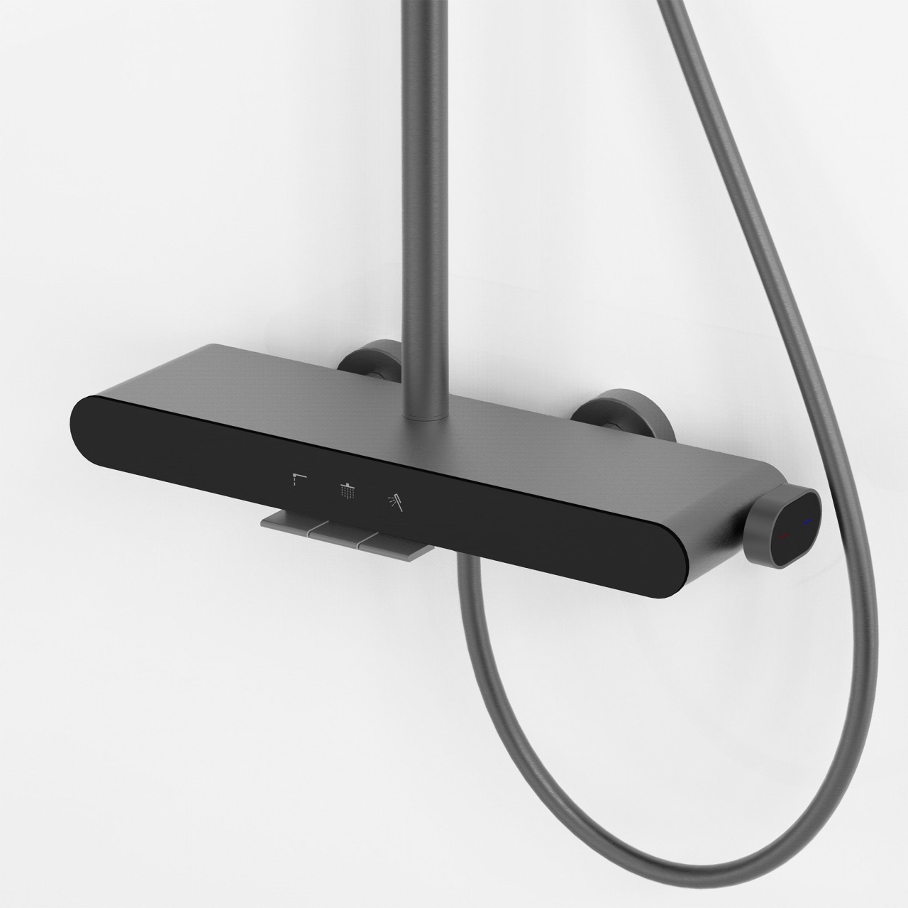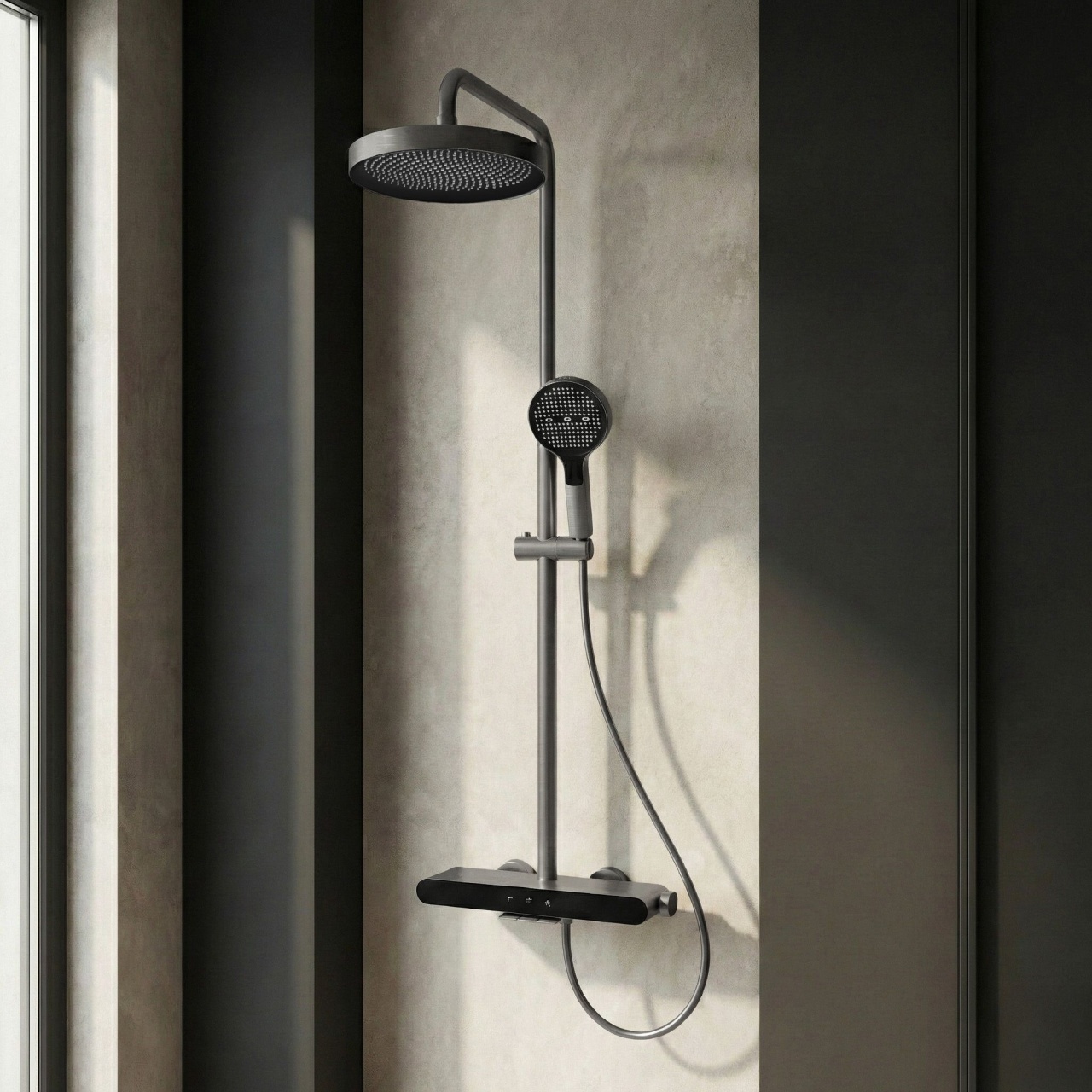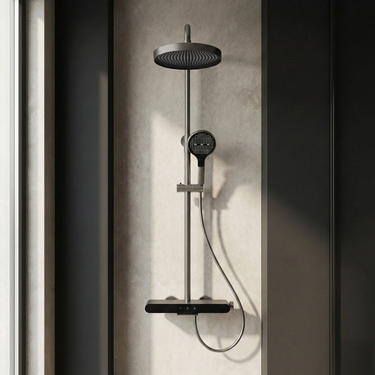 Oferă băii tale un caracter industrial aparte cu setul de duș aparent Rea Farel Titan. Acest model, cu finisaj titan periat, este alegerea ideală pentru cei care caută o alternativă la negru și crom. Setul combină un design metalic, brut, cu funcționalități inovatoare de control și întreținere a curățeniei.Culoare Titan – o nuanță elegantă de grafit, cu o textură fin periată. Finisajul satinat nu doar arată modern, ci este și practic – pe suprafața periată se văd mult mai puțin picăturile de apă și amprentele.Acoperire PVD – culoarea titan a fost aplicată prin tehnologia PVD (Physical Vapor Deposition). Este cea mai durabilă metodă de colorare a bateriilor, garantând rezistență excepțională la zgârieturi, matuire și coroziune.Panou Piano intuitiv – bateria este controlată prin trei butoane mecanice (clape). Această soluție comodă permite comutarea instantanee a fluxului de apă între para fixă, para de mână și pipă.Pară de duș cu funcție Bidetta – para include o funcționalitate suplimentară. Are un buton în spate și o duză în partea superioară. După activare, se transformă într-un pulverizator tip bideu, facilitând curățarea cabinei, spălarea cădiței sau umplerea recipientelor.Pipă cascadă discretă – corpul bateriei este echipat cu flux tip cascadă. Permite umplerea rapidă a unui bol, a unei găleți sau verificarea temperaturii apei direct la baterie.Materiale și reglaj – inima setului este un corp solid din alamă. Para fixă și para de mână, realizate din ABS ușor, au sistem anti-calcar. Întregul ansamblu este montat pe o bară cu înălțime reglabilă.Confort pentru toți – setul este echipat cu bară reglabilă pe înălțime, ceea ce permite adaptarea perfectă a poziției parei fixe la înălțimea utilizatorilor și la înălțimea tavanului.Setul Rea Farel Titanium îmbină precizia tehnologică cu un design unic. Acoperirea PVD din titan periat este un accent modern în interior, iar funcționalitatea avansată transformă utilizarea zilnică într-o adevărată plăcere. Culoare: Titan Material: Alamă, ABS Metodă de montaj: Suprafaţă Tip baterie: Monocomandă Înălțime min. : 870 Înălțime max.: 1280 Pipa cadă: Da, fixă Sistem Anti-Calc: Sistem Anti-Calc Tehnologia de acoperire: PVD Distanța dintre racorduri: 150 Garantie: 24 luni