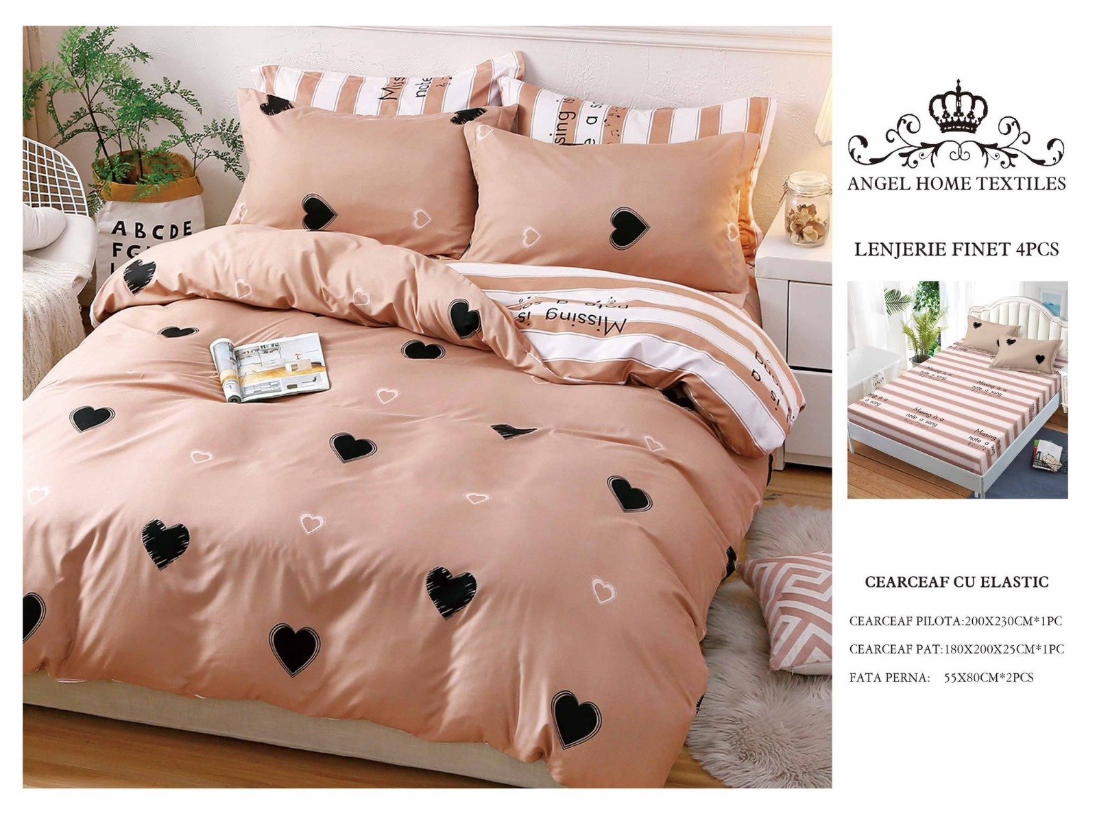 Lenjerie din finet pentru pat matrimonial compusa din 4 piese ce contine cearceaf de pat cu elastic, husa pentru pilota si 2 fete de perna.Aceasta lenjerie este eleganta, fina la atingere, perfecta pentru saltele cu dimensiunea de: 140x200/160x200/180x200 Setul este compus din:*Husa de saltea cu elastic: 180x200x25 cm*Husa de pilota: 200x230 cm*Fete de perna: 55x80 cm x 2 Bucăți Avantajele lenjeriilor de pat din finet:- Confort sporit;- Permite pielii sa respire;- Material foarte moale la atingere;- Rezistenta indelungata in timp;- Usor de intretinut;- Se spala la masina de spalat;- Nu necesita folosirea unui balsam de rufe- Nu necesita calcare termica;- Rezistenta sporita a culorilor , nu se decoloreaza in timp. Instructiuni de intretinere:- se spala la maxim 40°C automat pentru rezistenta indelungata a imprimeurilor;- nu se folosesc inalbitori chimici;- se recomanda ca produsul sa fie spalat inainte de prima utilizare pentru o igiena corecta si pentru a indeparta surplusul de vopsea din procesul de imprimare. Pozele sunt cu caracter informativ, astfel pot exista mici diferente de nuanta intre fotografia de prezentare si produs datorita prelucrarii fotografiei.